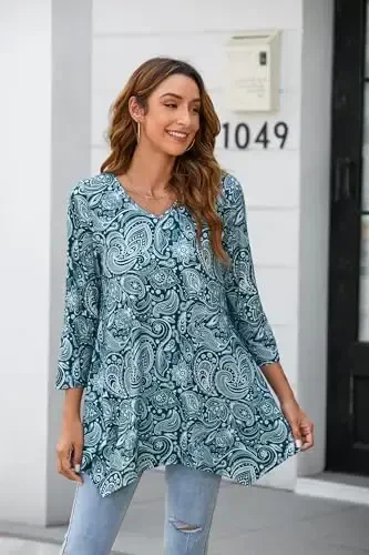 Combine style and comfort with ENMAIN Tunic Tops! These tunic tops are timeless pieces that should be in every woman's wardrobe. Available in round and V-neck options, these 3/4 sleeve tunics easily adapt to any style. These tops, which go perfectly with leggings, offer both a stylish and comfortable look. One of the most important features of ENMAIN tunics is that they skillfully camouflage the abdomen and hip area. Thanks to its fitting but not tight cut, it fits perfectly on every body and increases your self-confidence. Whether you wear it for daily use or for a special occasion, these tunics will always make you look stylish and elegant. These tunics are not only stylish but also incredibly comfortable. Made from a blend of 95% Polyester and 5% Elastane, these tops are soft, flexible and lightweight. It gently touches your skin and keeps you comfortable all day long. Thanks to its quick-drying feature, it minimizes the problem of sweating even in hot weather. Its flexible fabric does not restrict your freedom of movement and makes you feel comfortable all day long. In addition, thanks to its wide cut that you can easily use during pregnancy, it adapts to your growing belly and provides you with support throughout the day. ENMAIN tunic tops stand out not only with their comfort and elegance, but also with their eye-catching designs. Designed in a casual tunic style, these tops give the body a nice shape with their fit and flare cut. Stitching and pleat details on the front add a different touch to these blouses. Paisley, floral and other pattern options allow you to find a model suitable for every taste. These patterns allow you to display a striking and eye-catching appearance wherever you go. These tunics offer versatile use. In addition to being ideal for daily wear, it can be easily worn during pregnancy, for teachers, on holidays, in the office, on dates, shopping, parties, while doing sports, outdoors or at home. It is a great gift option that you can give to your loved ones on special occasions such as Valentine's Day, Christmas, Graduation, Mother's Day. ENMAIN tunic tops will be an indispensable part of your wardrobe and will always make you feel stylish and comfortable. Available in a wide size range from small to 3X, these tops offer an option suitable for every body type. You can easily find the size that suits you best by examining the size chart.