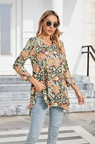 ENMAIN Women's Tunic Tops are a piece that combines elegance and comfort and is a candidate to be an indispensable part of your wardrobe. These tunics, which you can easily prefer in any environment from daily use to your special days, attract attention with their unique designs and quality fabrics. These long tops, which offer a wonderful harmony especially when combined with leggings, offer all-day comfort thanks to their comfortable cuts, while dazzling with their stylish details. You can easily adapt these tunics to any environment, whether you wear them on a daily outing, at work, or at a stylish dinner.One of the most distinctive features of ENMAIN tunics is their comfortable and baggy cuts. This cut allows you to look stylish without restricting your freedom of movement. You can prefer these tunics especially in hot weather, and they help you stay cool all day long thanks to their non-sweating and breathable fabrics. At the same time, it helps you achieve a more fit look by gently covering your body lines.The 3/4 sleeve length and V-neck detail add a special elegance to these tunics. The 3/4 sleeve length keeps you cool in hot weather and makes your arms look thinner than they are. The V-neck makes your neck look longer and more elegant, balancing your overall appearance. These details turn the tunic from just a comfortable garment into a stylish and modern piece.ENMAIN aims to offer options suitable for every body type. For this reason, our tunics are also available in plus size sizes. Thanks to their comfortable cuts and body-hugging designs, they make you look great on every body. Designed to make you feel safe and stylish, these tunics will be one of the essentials of your wardrobe.Color and pattern diversity is another important feature of ENMAIN tunics. It allows you to reflect your personal style by offering color and pattern options suitable for every taste and style. Whether you prefer vibrant and energetic colors or more simple and classic patterns, you will definitely find an option suitable for you in the ENMAIN collection. In this way, you can create a different style every day and enrich your wardrobe.ENMAIN Women's Tunic Tops not only offer comfort and style, but also offer versatile use. It can be easily combined with leggings, trousers, skirts or shorts. By complementing it with different accessories and shoes, you can achieve a look suitable for any environment. Whether you want to create a sporty style or achieve a more elegant and formal look, these tunics will help you in every way.Reflect your style with ENMAIN, enjoy comfort and elegance. These tunics, which will be the indispensable of your wardrobe, will accompany you in every season and in every environment. Designed to make you feel special and beautiful, these tunics will add color to your life.