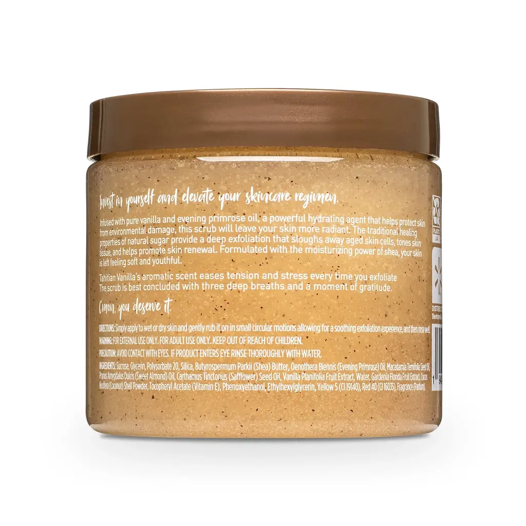 **Equate Tahitian Vanilla Bean Sugar Scrub**Equate Tahitian Vanilla Bean Sugar Scrub is a natural skin care product designed to leave your skin looking radiant, soft, and smooth.**Product Features:*** Features the exotic scent of Tahitian vanilla* Brown sugar gently exfoliates away dead skin cells to reveal healthy skin* Jojoba oil hydrates the skin, leaving it feeling soft* Shea butter helps maintain the skin's elasticity and moisture* Paraben-free* Sulfate-free* Dermatologist tested**Directions for Use:*** Apply to wet skin in circular motions.* Massage gently for 1-2 minutes.* Rinse with warm water.* Use 1-2 times per week.Equate Tahitian Vanilla Bean Sugar Scrub is suitable for all skin types. With regular use, it helps your skin achieve a more radiant, smooth, and healthy appearance.