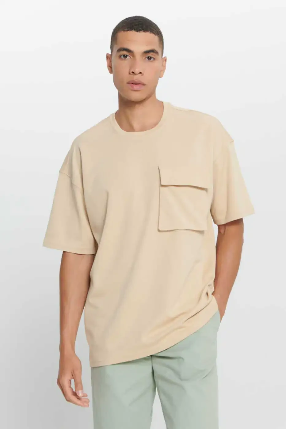 Bej Oversize Erkak Futbolka | Paxta, Keng Kesim, Velosiped Yoqa