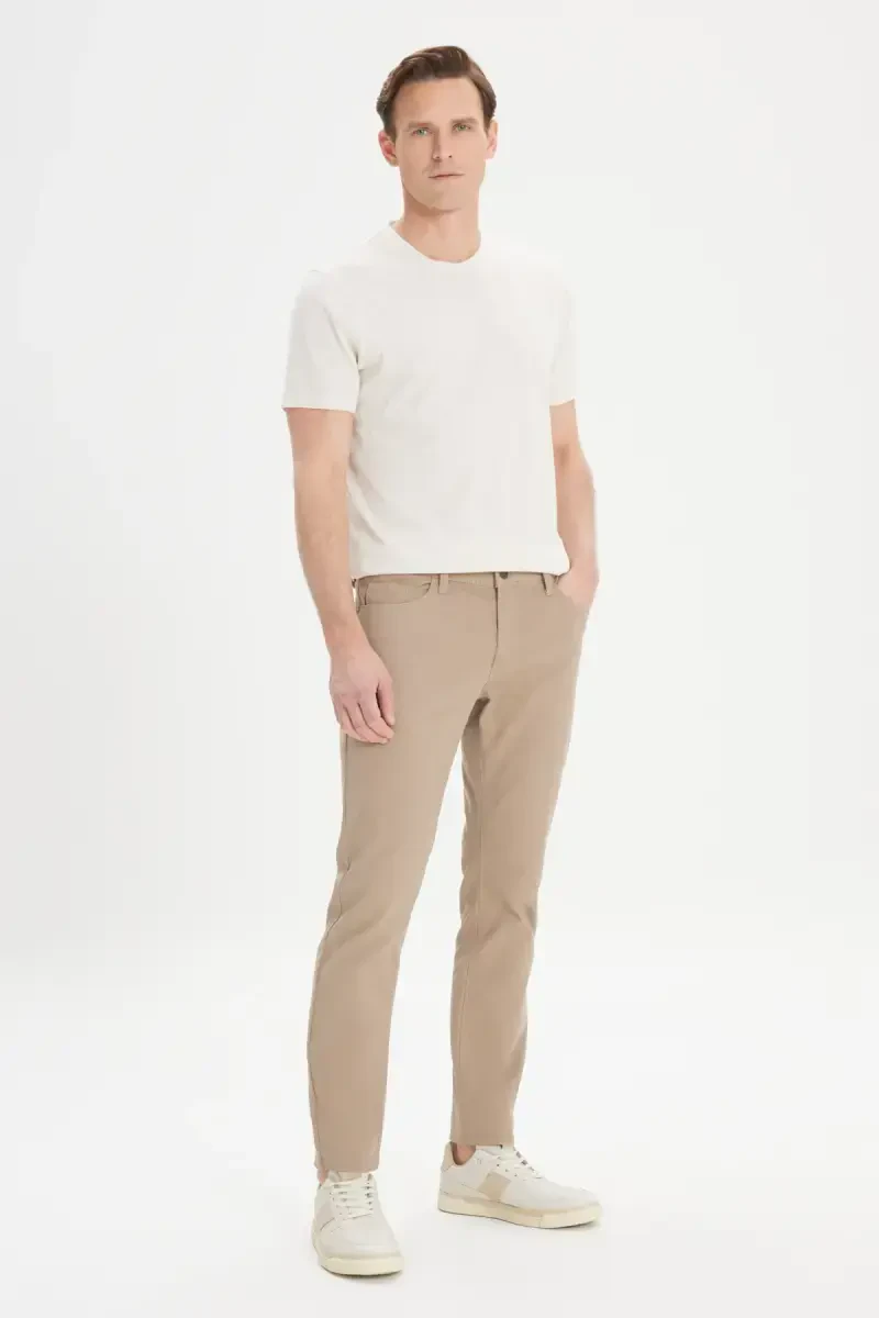 Bej Slim Fit Erkak Pantolon | Armürlü, Tor Kesim, 5 Cho'ntakli, Elastik, Paxtali