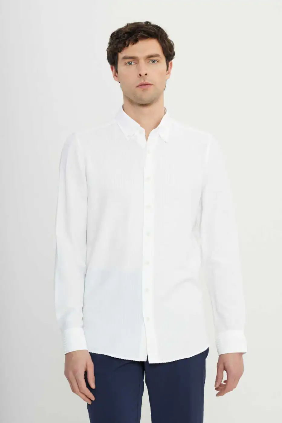 Oq Slim Fit Armürli Erkak Ko'ylak | Tor Kesim Tugmali Yoqa