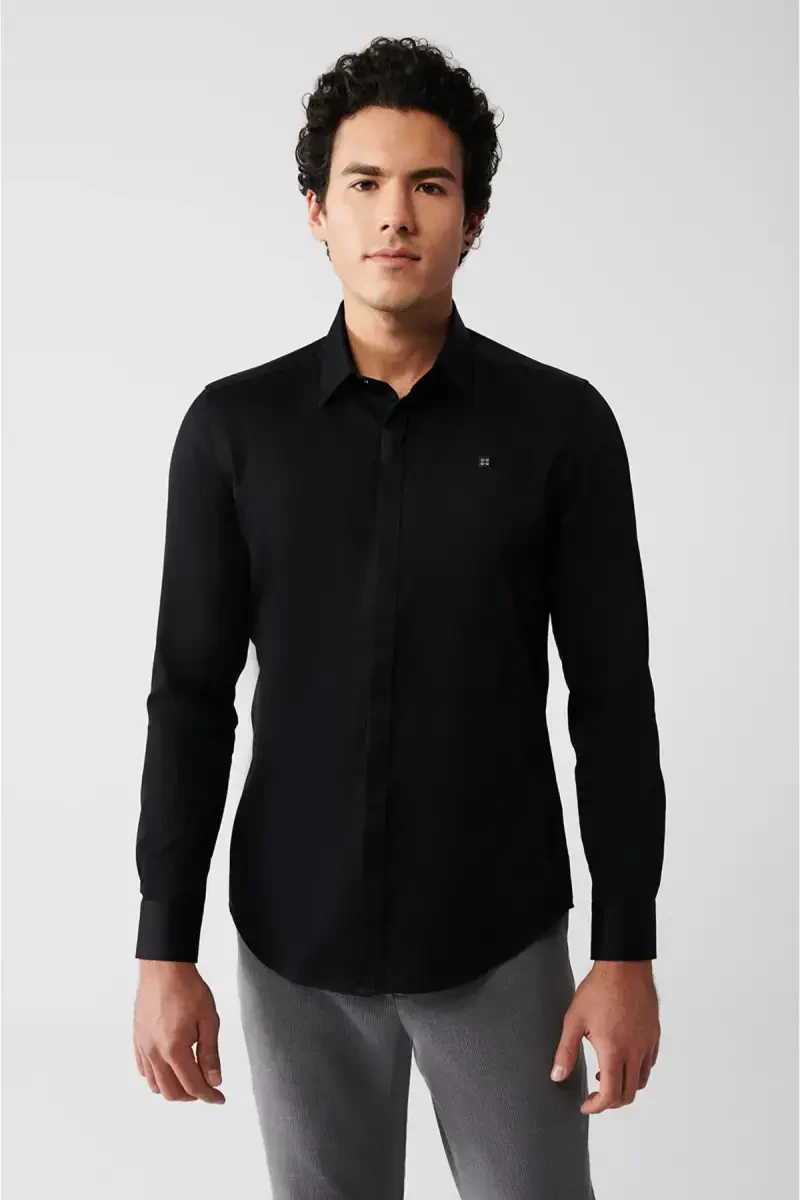 Qora Slim Fit Paxta Saten Erkaklar Ko'ylagi | Klassik Yoqa Uzun Qisma