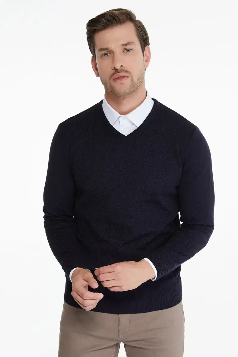 Erkak kazak, to'q ko'k kazak, V yoqali kazak, trikotaj kazak, naqshli kazak, erkaklar kiyimi, zamonaviy kazak, qulay kazak, mashinada yuvish mumkin, triko