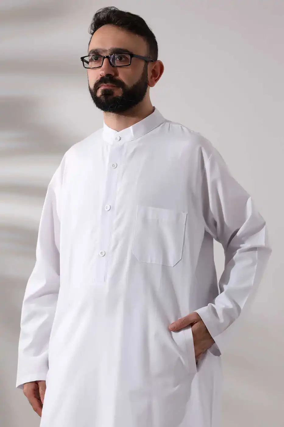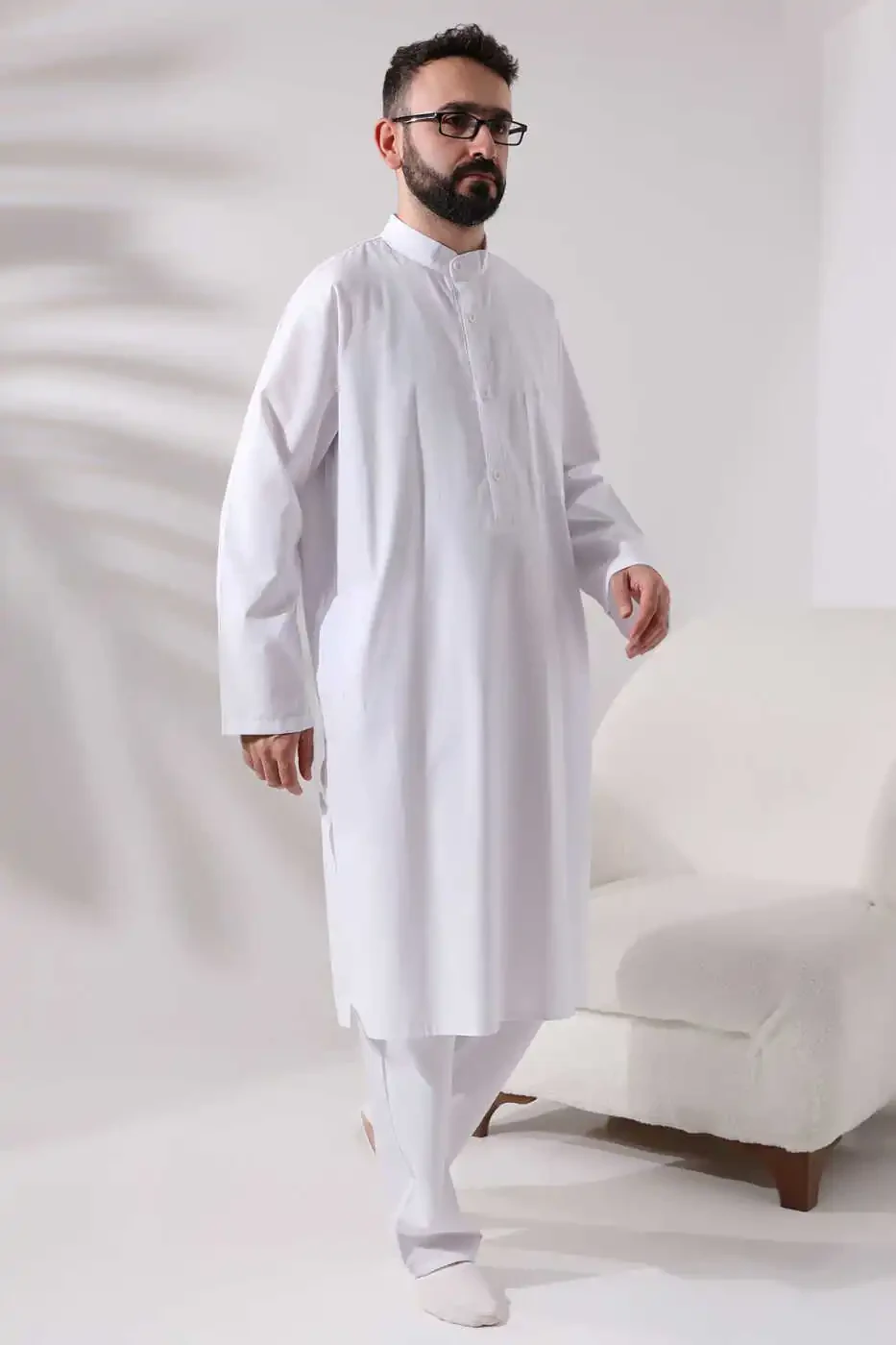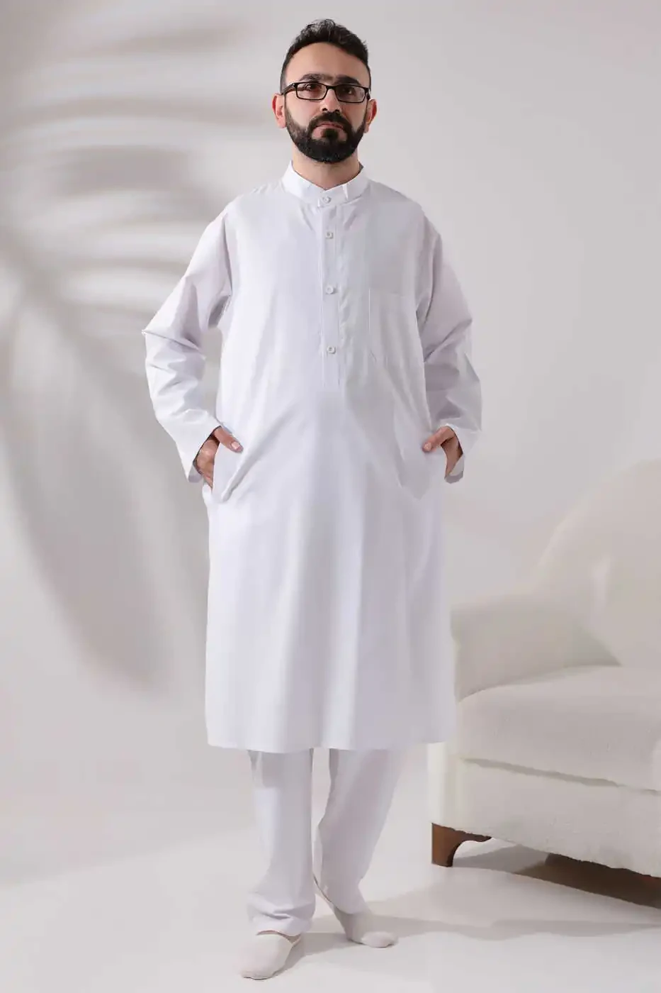 Erkaklar uchun Haj va Umra kiyimi ikki qismli pastki ust afg'on to'plami oq rangda Haj va Umra ibodatlaringizni ado etsangizda ham an'anaviy, ham qulay uslubga ega bo'lishingizni ta'minlaydi. An'anaviy afg'on uslubi bilan zamonaviy qulaylikni birlashtirgan bu maxsus dizayn, qulay kesimiga rahmat sizga uzoq ibodat vaqtlarini muammosiz o'tkazishga yordam beradi.