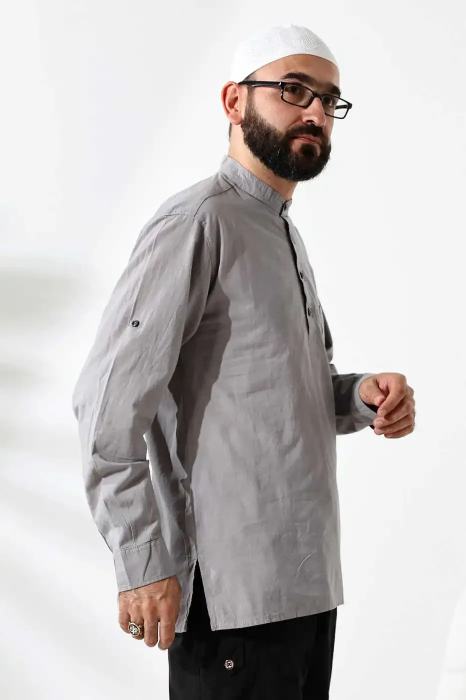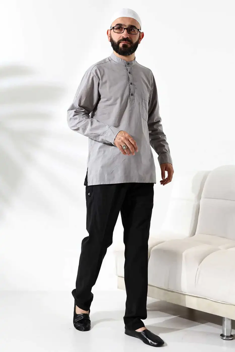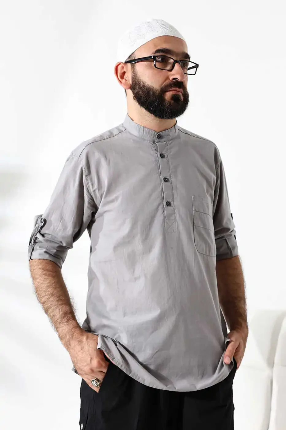 Erkaklar uchun 100% paxtadan tayyorlangan, bo‘sh kesim, xalq yoqali, yarim tugmachali, kulrang haj va umra ko‘ylagi kundalik kiyim sifatida idealdir. Basic to‘plamiga kiruvchi ushbu ko‘ylak qulaylik va oqlanganlikni birlashtirib, shkafingizning ajralmas qismi bo‘ladi. Xalq yoqasi zamonaviy va oqlangan ko‘rinish beradi, tugmachali yopilishi esa uni osongina kiyish va yechish imkonini yaratadi. 100% paxtadan tayyorlangan matolari teriga yoqimli teginishlarni taqdim etib, maksimal darajada qulaylik yaratadi. Bo‘sh kesim naqshi tanaga yopishib turuvchi, lekin siqmaydigan tuzilishni taklif qiladi va turli tana tuzilmalariga mos keladi.