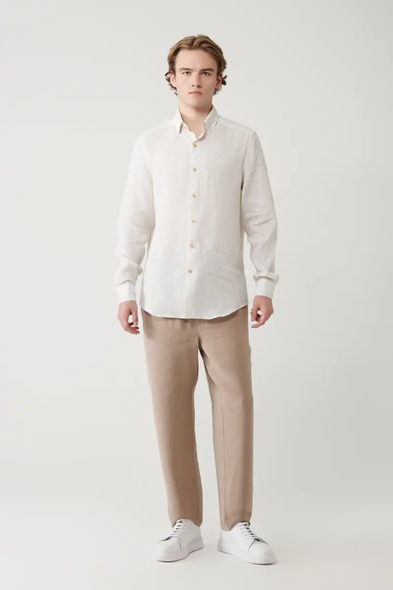 Stil va qulaylikni birlashtirgan erkaklar uchun bej ko'ylagi, sizning shkafingizning ajralmas qismi bo'ladi. Britaniya yoqasi va barg naqshli dizayni bilan sizning uslubingizga o'ziga xos joziba qo'shadigan bu ko'ylak 100% zig'ir matodan tayyorlangan. Zig'irning tabiiy nafas olishi va yengilligi sizni kun bo'yi qulay his qilishingizni ta'minlaydi.