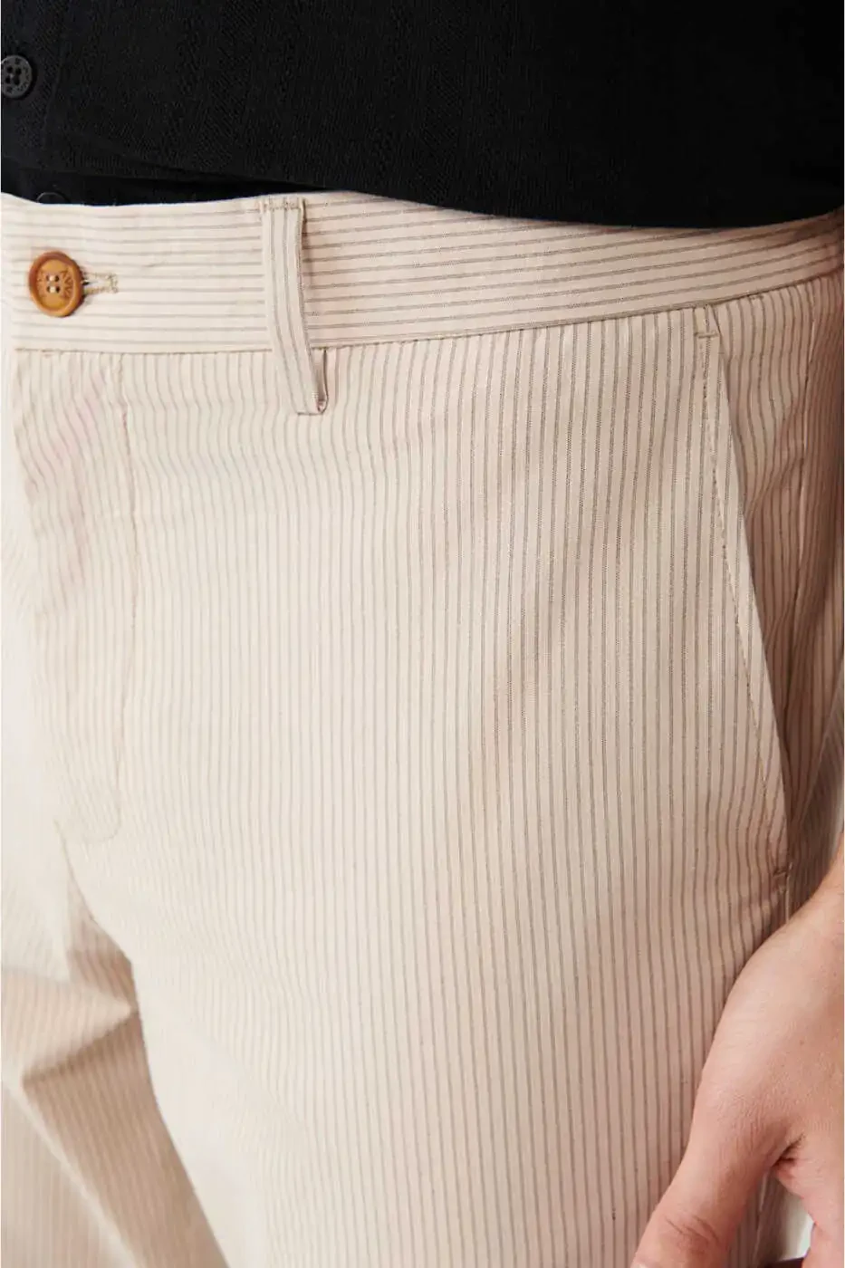 Erkaklar uchun bej rangli elastik belbog'li, shnuri bor, chiziqli, bo'shashgan kesimdagi kundalik shim - A31y3206