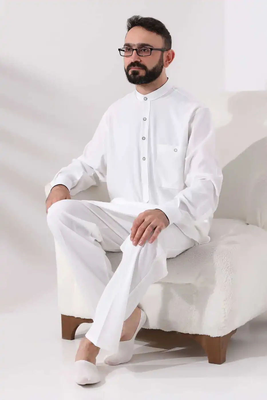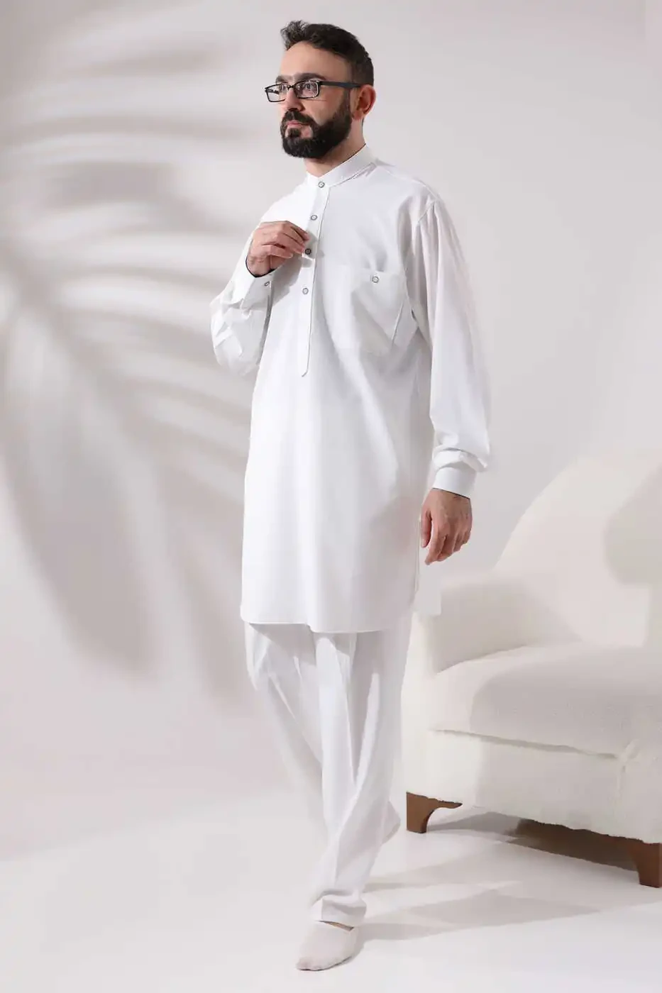 **Erkaklar Berat Haj Va Umra Kiyimlari Ikki Qismli Viskon Afgʻon Kostyumi Ekru**Anʼanaviy afgʻon uslubini zamonaviy qulaylik bilan birlashtirgan Berat Haj va Umra kiyimlari sizning haj va umra ibodatlaringizni tinchlik ichida oʻtkazishingizni taʼminlaydi. Ikkita qismdan iborat boʻlgan bu kostyum, oʻziga xos dizayni bilan qulay kiyinish imkoniyatini taqdim etadi.**Hususiyatlari:*** 50% Viskon, 50% Paxta* Neyhru yoqasi* Yenglari tugmachali koʻylak* Uch tugmachali koʻylak* Chapda bitta choʻntagi bor koʻylak* Ikki yon choʻntagi, ikki orqa choʻntagi bor shimlar**Foydasi:*** Ibodatlar paytida qulay kiyim kiyish imkoniyatini yaratadi.* Anʼanaviy afgʻon uslubining zamonaviy talqinini taqdim etadi.* Yumshoq va nafas oladigan matolari tufayli qulaylikni oshiradi.* Ayniqsa haj va umra ibodatlari uchun moʻljallangan.Bu erkaklar uchun moʻljallangan afgʻon kostyumi bilan siz haj va umra marosimlaringizni ham anʼanaviy koʻrinishda, ham qulay tarzda bajarishingiz mumkin. **İhvan Online** kafolati bilan buyurtma bering va ibodatlaringizni tinchlik ichida oʻtkazing.