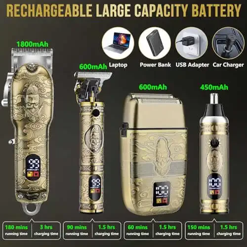 Soch kesish seti, soqol olish vositasi, mo'ylov shakllantirish vositasi, quloq tozalash vositasi, burun tuklarini olib tashlash vositasi, simsiz, ergonomik, qayta zaryadlanuvchi, metall korpusli, professional