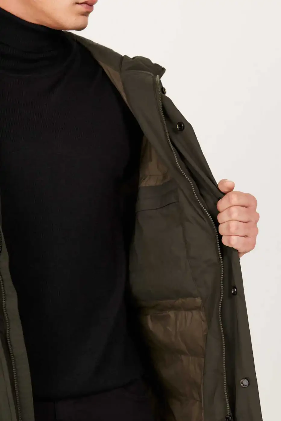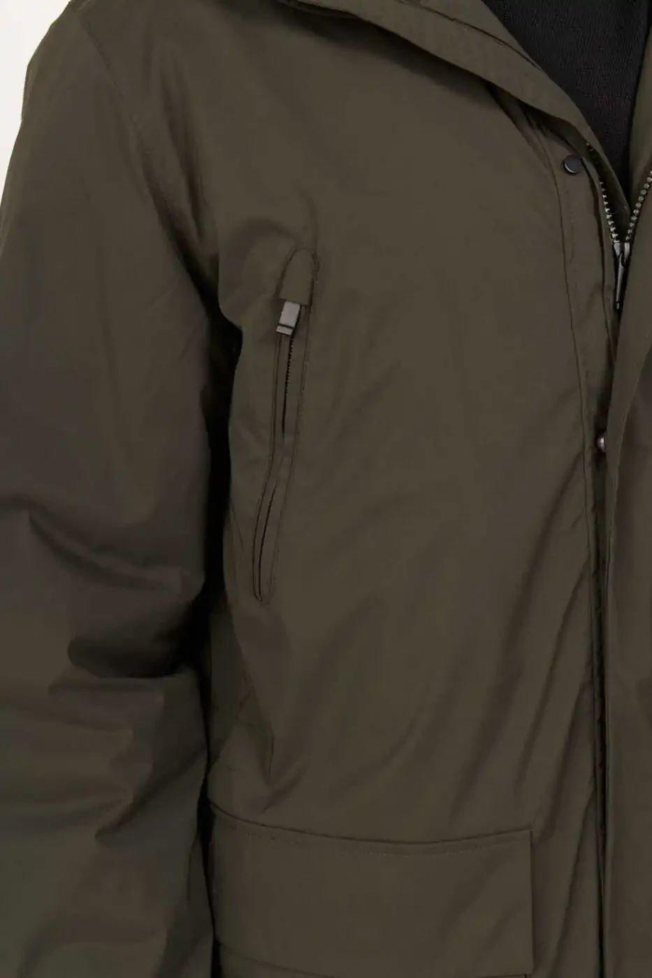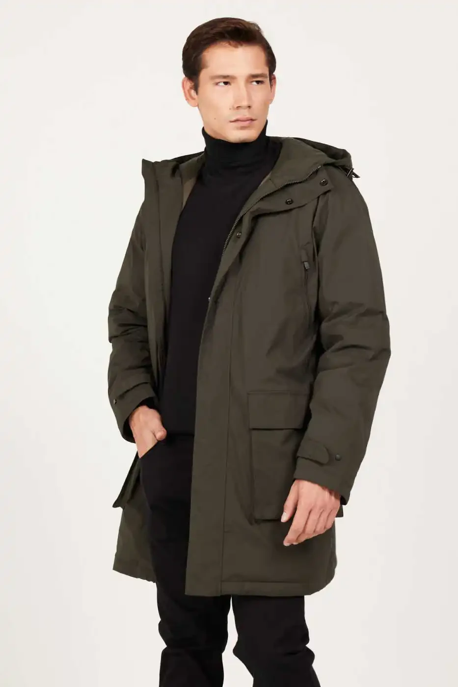Erkaklar uchun haki rangli standart o'lchamli oddiy kesimli kaputli palto - Nafias va qulay