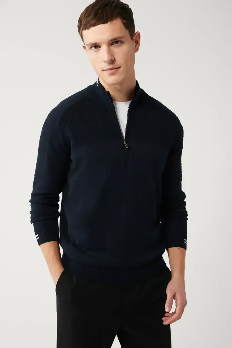 Yumshoq va yuqori sifatli jun matosiga ishlab chiqarilgan ushbu sviter kun bo'yi qulay foydalanishni ta'minlaydi. Fermuarli tik yoqa dizayni turli kombinatsiyalar yaratishga imkon beradi, shu bilan birga qo'l chiziqlari tafsilotlari nafislikni oshiradi.