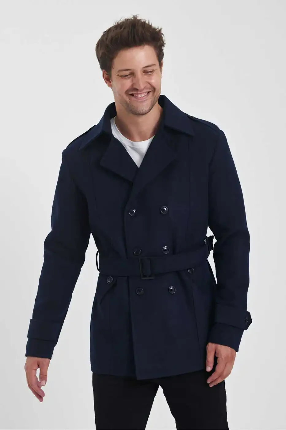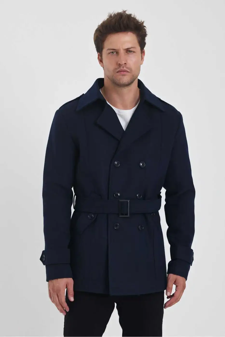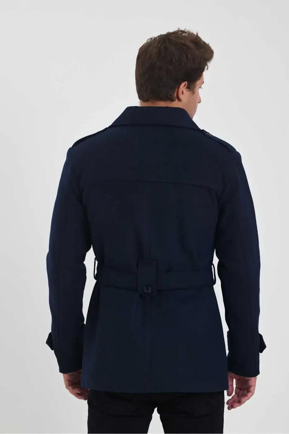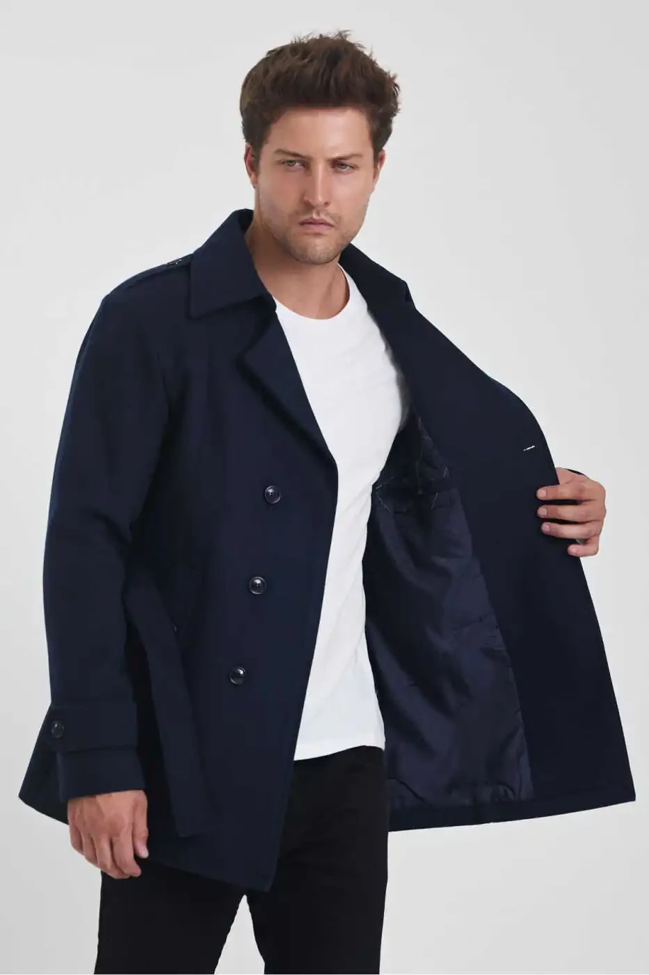 Ushbu erkaklar uchun ko'k rangli ikki tomonlama yoqa bilan tor qiya palto, sovuq qish kunlarida sizni ham zamonaviy, ham iliq saqlash uchun mo'ljallangan holda, nafislik va iliqlikni birlashtiradi.