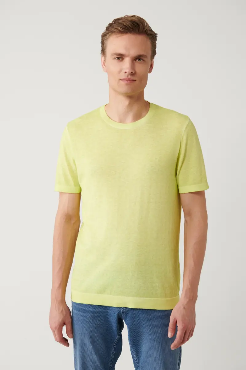 Erkaklar uchun neon yashil rangli krujka yoqali Garment Dyed bo'yoq effekti bilan regular fit triko futbolkasi, kundalik hayotda, do'stlaringiz bilan uchrashuvda, sport mashg'ulotlarida yoki maxsus kunlarda qulay va zamonaviy ko'rinish yaratish uchun ideal tanlov bo'lib, shkafingizning ajralmas qismiga aylanadi.