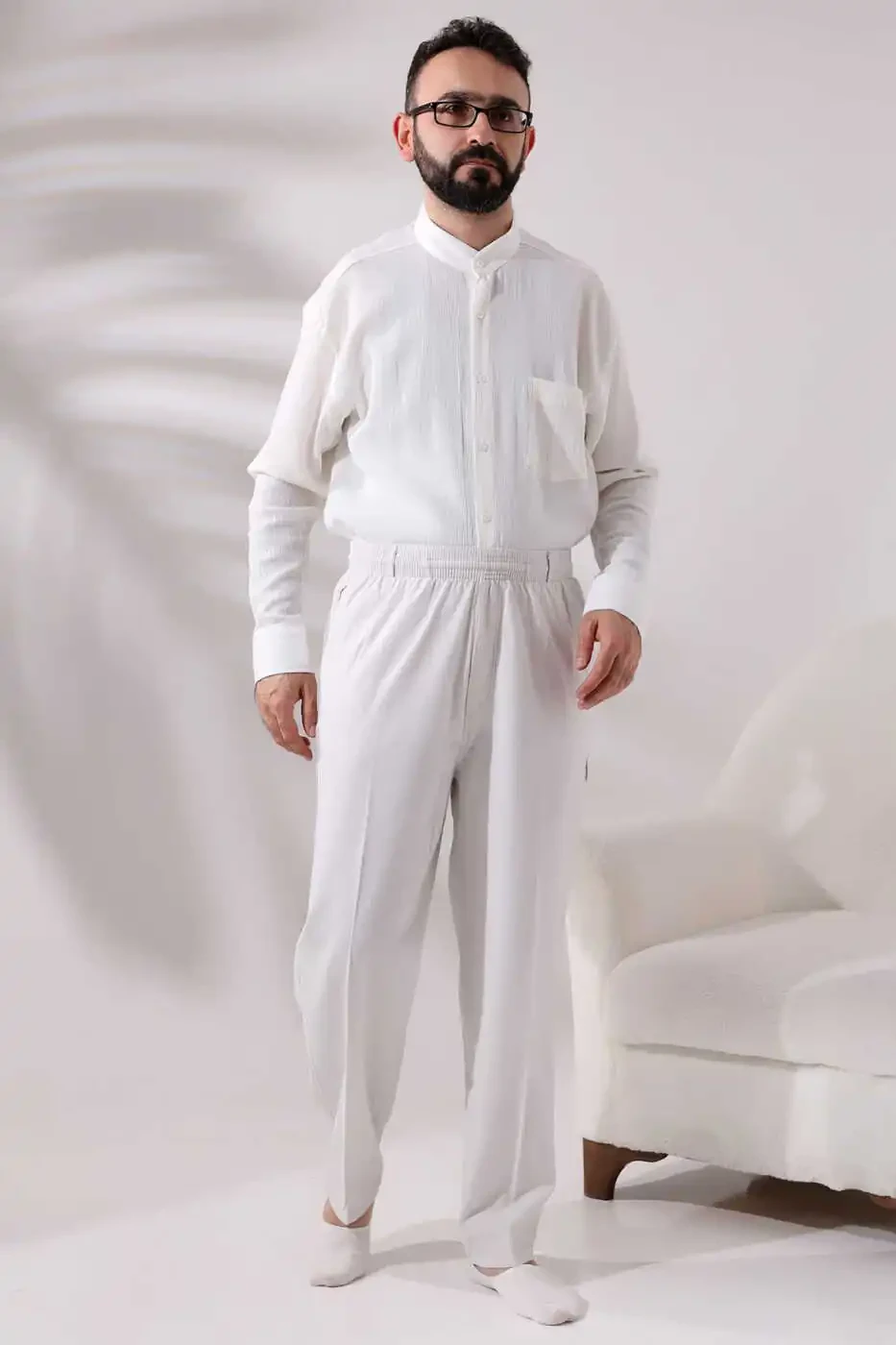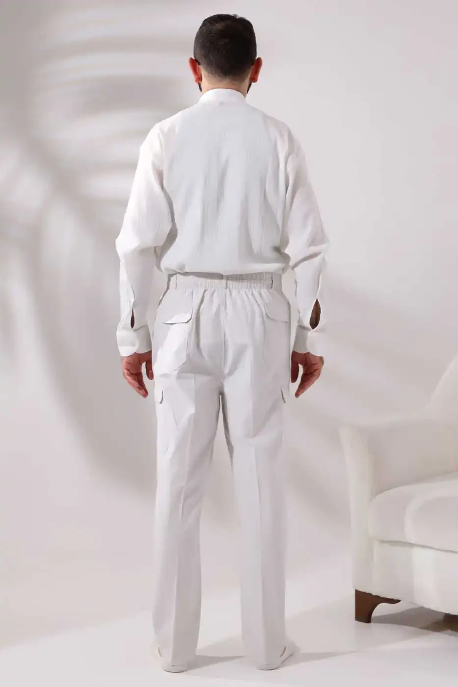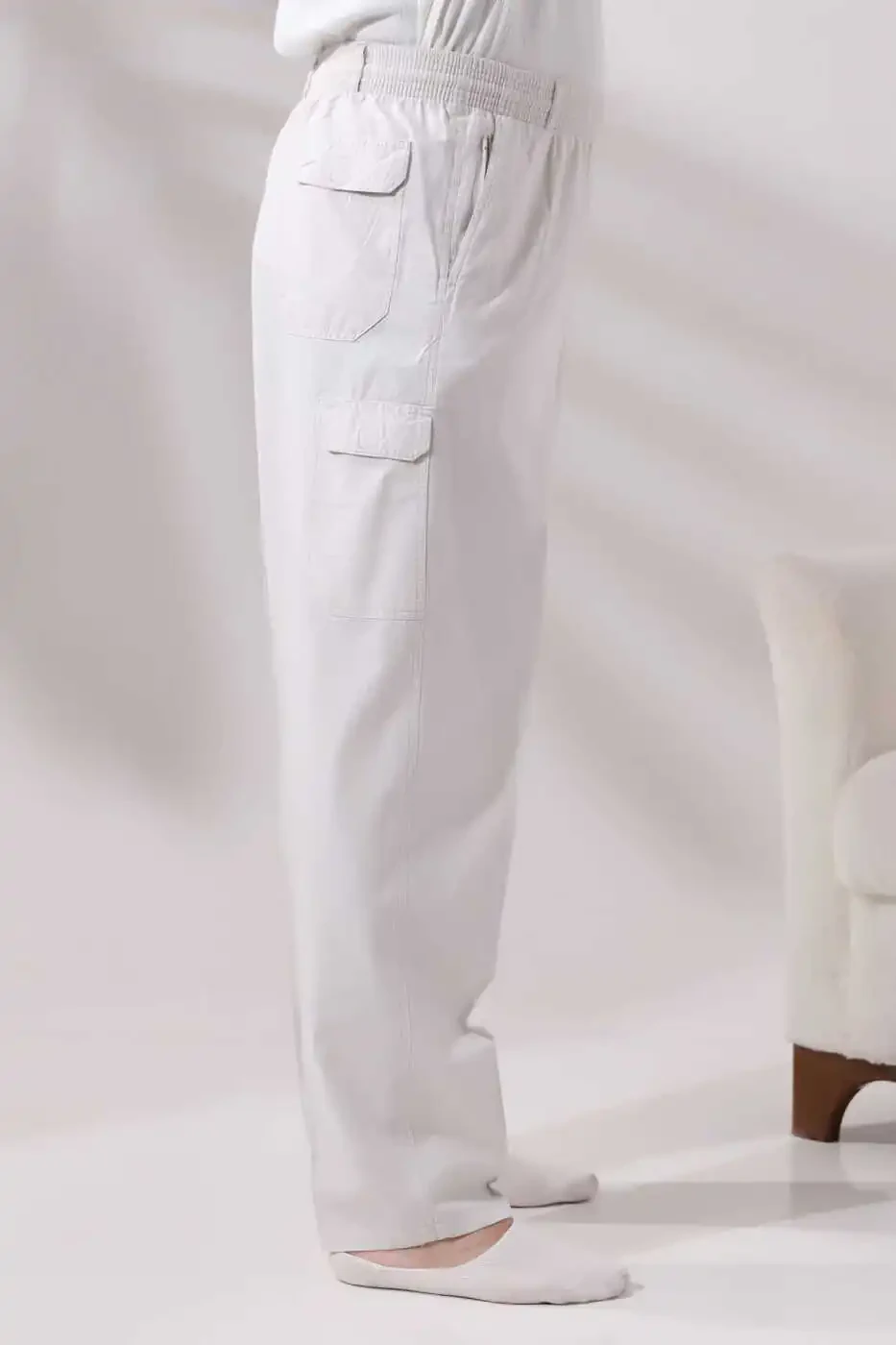 Erkaklar uchun och ochiq krem rangli yon tomonli cho‘ntakli qulay kiyimli belbog‘li kargo hajj va umra shimi kundalik hayotingizda, hajj va umra kabi diniy ibodatlaringizda qulay va zamonaviy tajriba taklif etadi. Och ochiq krem rangi turli xil kombinatsiyalar bilan osongina uyg‘unlashadi va juda ko‘p qirrali foydalanish imkoniyatini beradi. Bu shim qulay kiyimli kesimi bilan tanangizni siqmasdan harakat erkinligini ta'minlaydi. Beli bog‘li ekanligi sabab tanangizga mos tushadi va noqulaylik tug‘dirmaydi. Ikki orqa cho‘ntagi va to‘rt yon cho‘ntagi bor ekanligi sabab narsalaringizni ishonchli tarzda ko‘tarishingiz mumkin. Pilla tolasi bilan ishlangan matolari salqinlikni saqlab turadi va terlashga yo‘l qo‘ymaydi. Ayniqsa yoz oylarida qulay foydalanish taqdim etuvchi pilla mato tanangizga havo olish imkonini beradi. Matoning to‘qimasi yirik teshikli tuzilishga ega ekanligi sabab tanadagi namni tortib oladi va aksi ettiruvchi xususiyatga ega ekanligi sabab rang o‘chishi kabi holatlarni kamroq uchraydi.