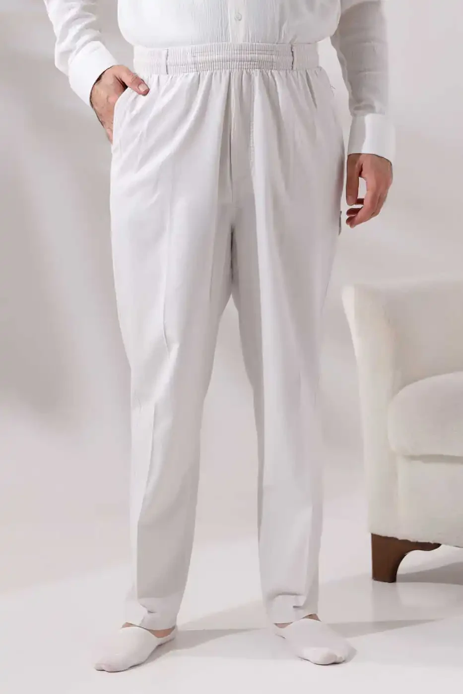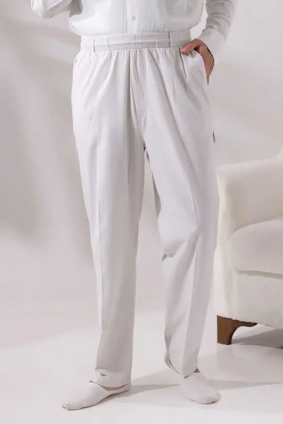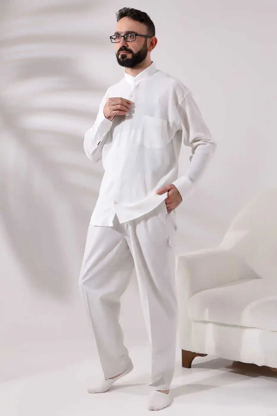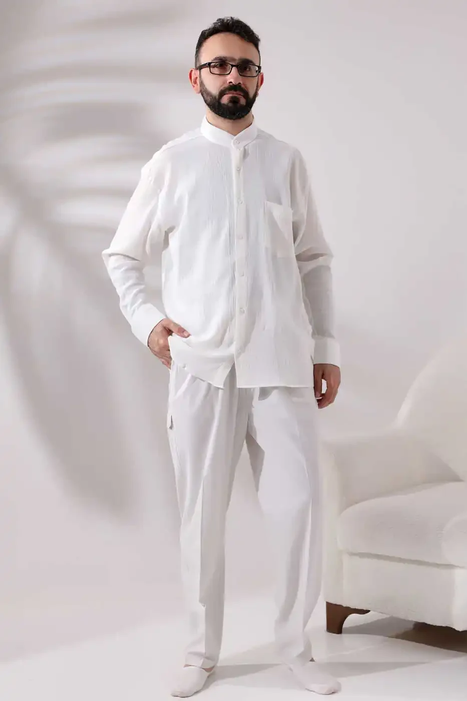 Erkaklar uchun och ochiq krem rangli yon tomonli cho‘ntakli qulay kiyimli belbog‘li kargo hajj va umra shimi kundalik hayotingizda, hajj va umra kabi diniy ibodatlaringizda qulay va zamonaviy tajriba taklif etadi. Och ochiq krem rangi turli xil kombinatsiyalar bilan osongina uyg‘unlashadi va juda ko‘p qirrali foydalanish imkoniyatini beradi. Bu shim qulay kiyimli kesimi bilan tanangizni siqmasdan harakat erkinligini ta'minlaydi. Beli bog‘li ekanligi sabab tanangizga mos tushadi va noqulaylik tug‘dirmaydi. Ikki orqa cho‘ntagi va to‘rt yon cho‘ntagi bor ekanligi sabab narsalaringizni ishonchli tarzda ko‘tarishingiz mumkin. Pilla tolasi bilan ishlangan matolari salqinlikni saqlab turadi va terlashga yo‘l qo‘ymaydi. Ayniqsa yoz oylarida qulay foydalanish taqdim etuvchi pilla mato tanangizga havo olish imkonini beradi. Matoning to‘qimasi yirik teshikli tuzilishga ega ekanligi sabab tanadagi namni tortib oladi va aksi ettiruvchi xususiyatga ega ekanligi sabab rang o‘chishi kabi holatlarni kamroq uchraydi.