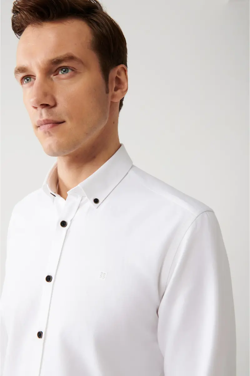 Kundalik kiyimlar va maxsus tadbirlar uchun juda mos keladigan, uslub va qulaylikni birlashtirgan erkaklar uchun oq ko'ylak bilan tanishing! Zamonaviy uslub uchun tugmali yoqali bu ko'ylak 100% paxta va viskoz aralashmasidan tayyorlangan. Ushbu maxsus mato nafas olishga, yumshoqlikka va bardoshlilikka ega bo'lib, kun bo'yi qulaylik beradi. Regular fit kesim tanangizga mukammal darajada mos keladi, harakatlanish erkinligini ta'minlaydi va zamonaviy ko'rinish yaratadi.