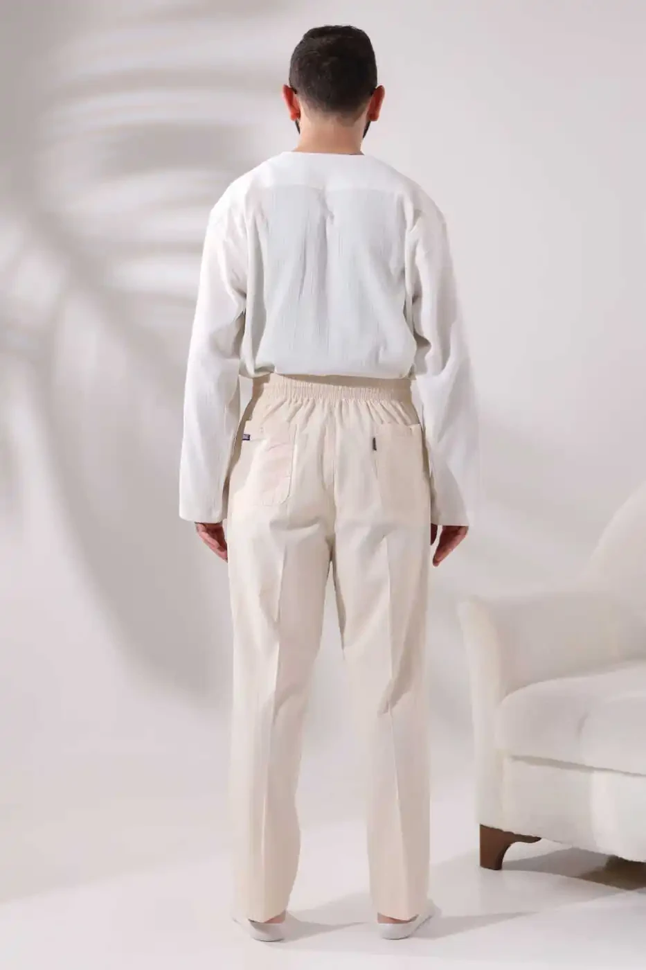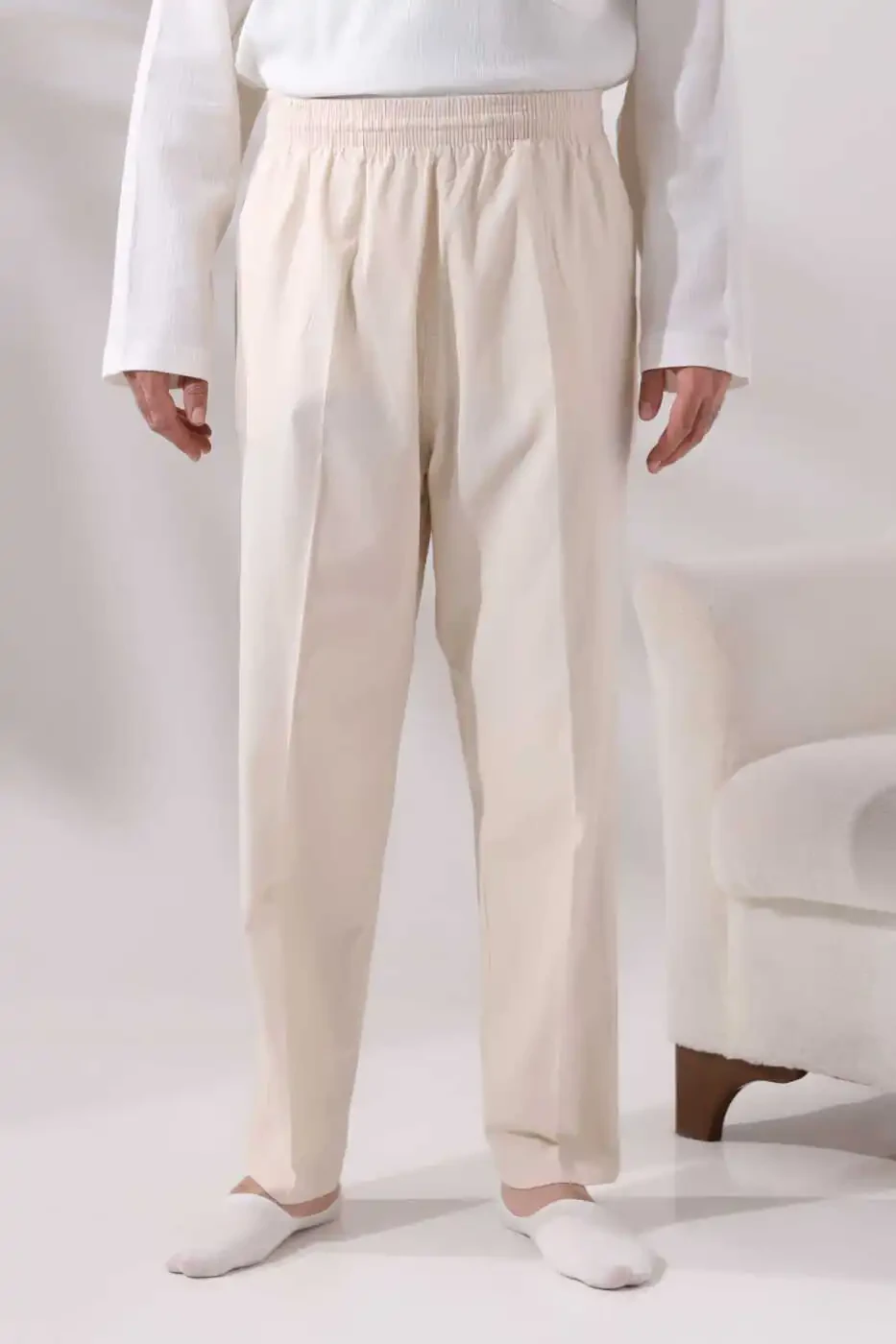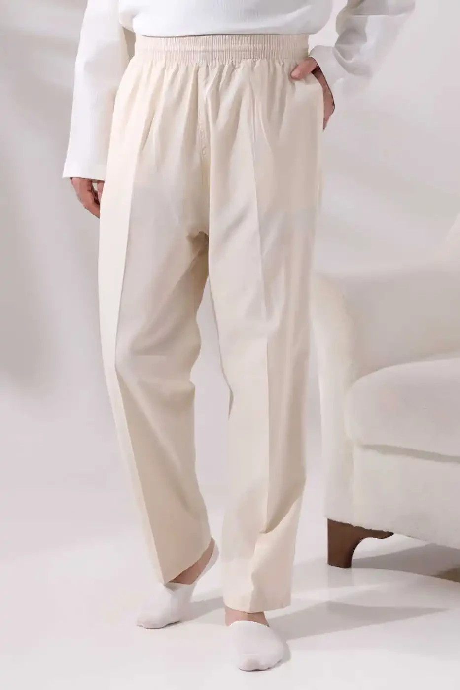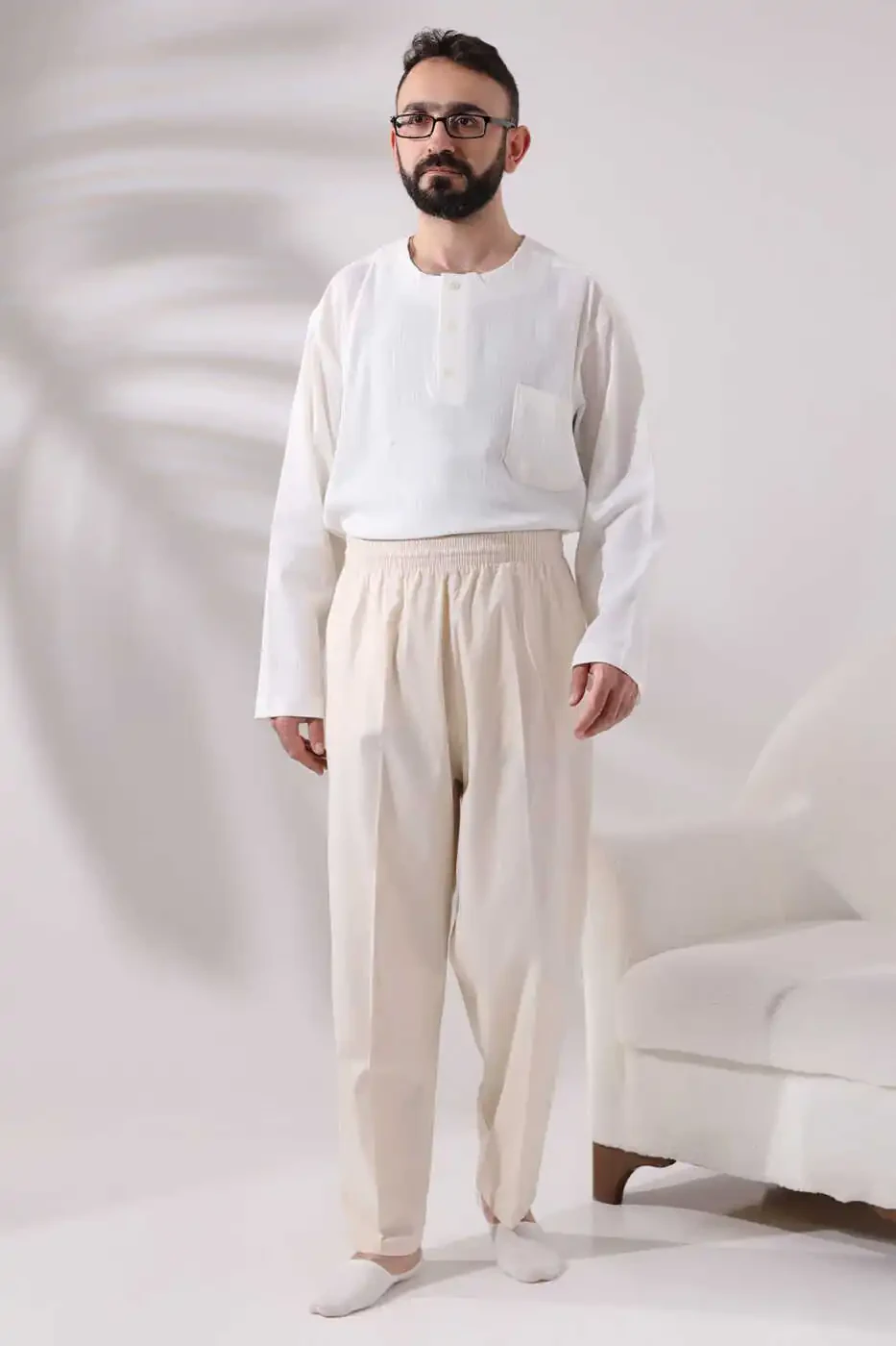 Намоз ва умра учун эркаклар учун керим рангидаги чингор кесма, жуда кулай, камар бели ластик ва сай-палати кенг иштани бар. Намоз ва умра каби диний маросимлардаги махсус либос талабларига жавоб берадиган бу иштон, шу билан бирга, жуда созли тарзда ясалган. Бу иштон сизга бутун бир йил кулайлик бахш этади ва узини устида жуюрилиб турмаслиги туфайли бундай энг узоқ ваqtларда хам жуда соз. Кундалик тутиш учун, диний маросимлар учун, муносабат ва тантанали чоралардаги энг яхши ва мувофиқ танлов.