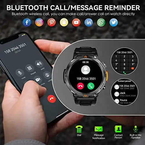 Erkaklar uchun mukammal hamroh, bu harbiy aqlli soat sizning kundalik hayotingiz uchun kerak bo'lgan hamma narsani taqdim etadi. O'zining oqlangan dizayni va mustahkam tuzilishi bilan bu soat har qanday faoliyatda sizni hayratga soladi.