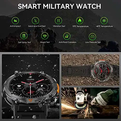 Harbiy aqlli soat, erkaklar uchun aqlli soat, LED chiroq, 1.45'' HD displey, sportni kuzatish, yurak urish tezligi monitori, uyqu monitori, iPhone Android bilan mos keladi, suv o'tkazmaydigan, uzoq batareya muddati, maqbul narx