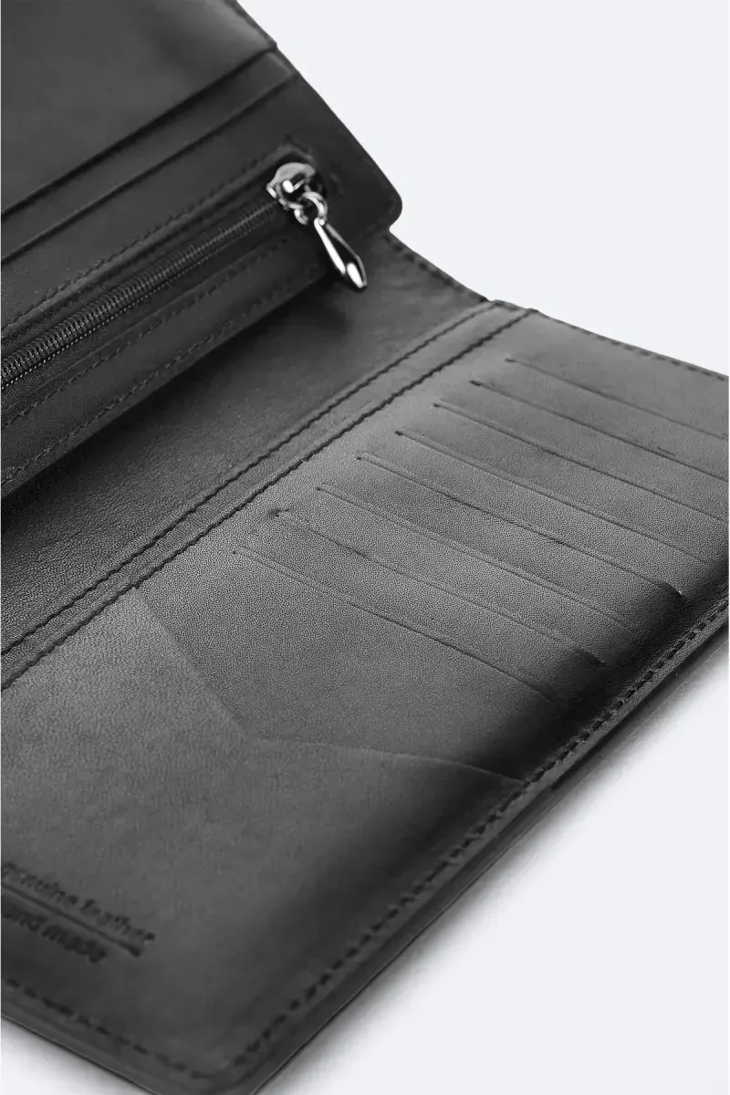 Banknotlar uchun cho'ntagiga ega asosiy bo'lim, bir tomonida to'qqiz bo'lim, boshqa tomonida fermuarli bo'lim va to'rtta karta uyalari. 100% Teri Hamyon