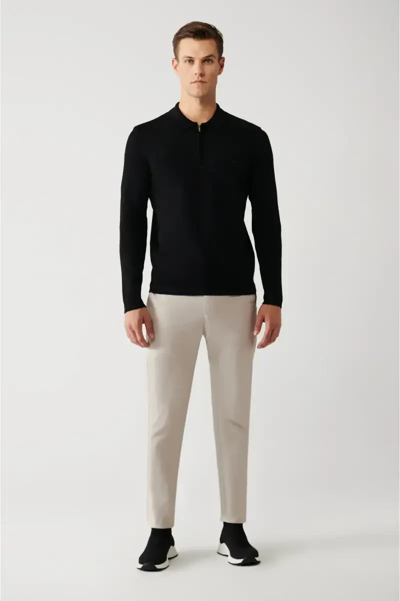Erkaklar uchun qora rayon triko kazak fermuarlı polo yoqasi Regular Fit A32y5199, kundalik kombinlaringizda ziyofat yaratish uchun ideal tanlovdir. Jinsi shimlar, chino shimlar yoki shortilar bilan birlashtirishingiz mumkin, shu bilan har qanday muhitda uslubingizni aks ettirasiz. Bundan tashqari, maxsus kunlarda ham chiroyli ko'rinish yaratish uchun tanlashingiz mumkin.