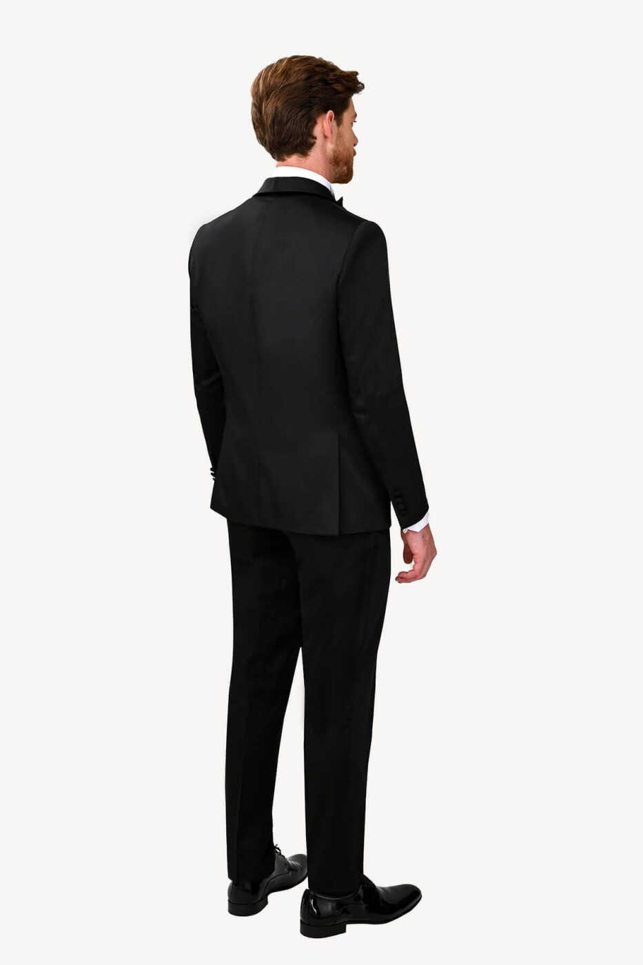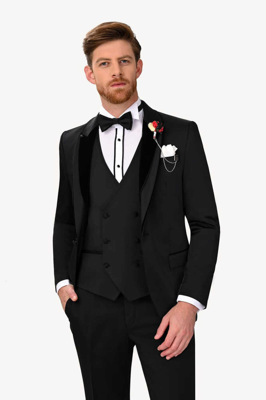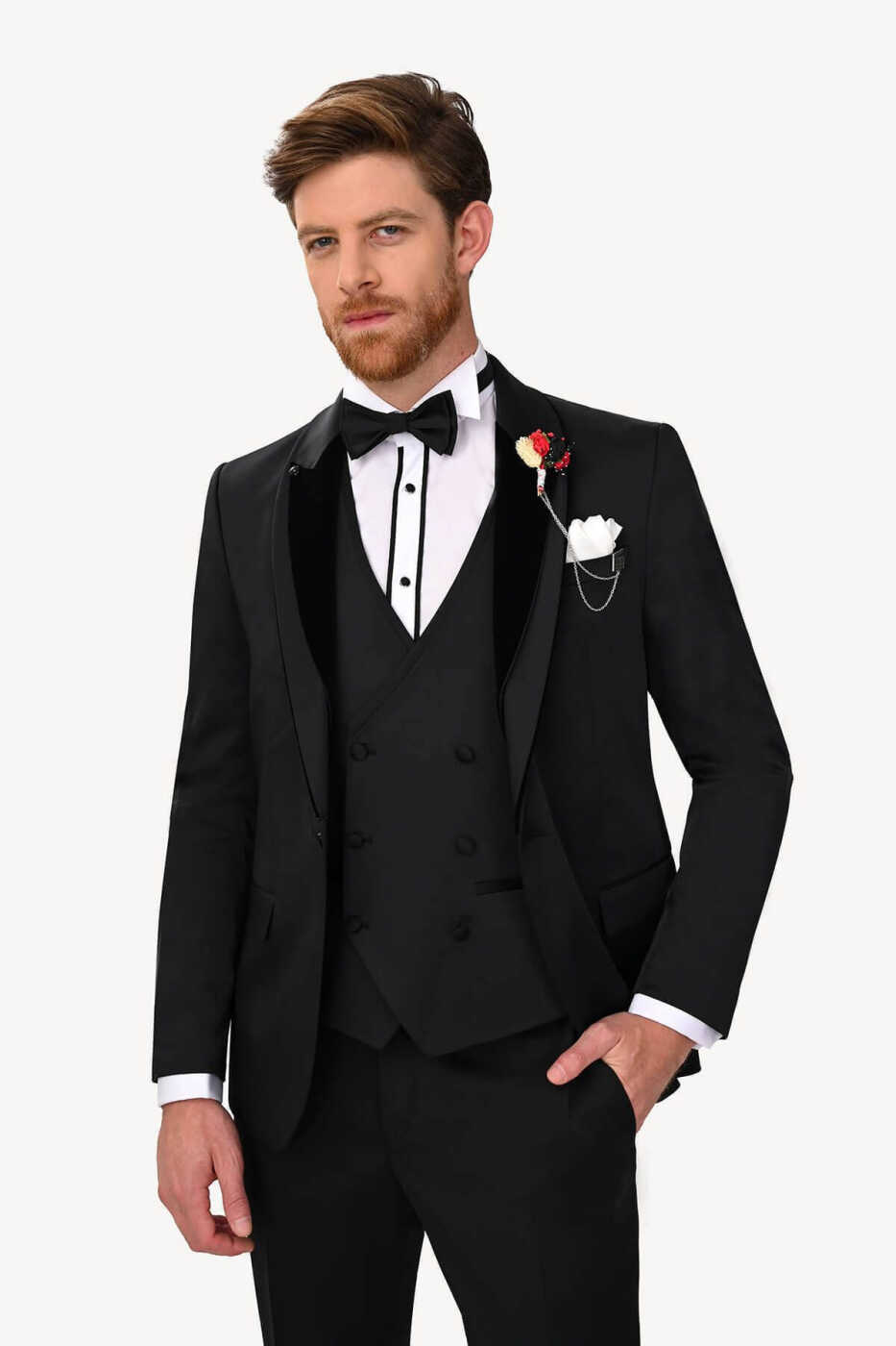 Erkaklar uchun qora rangli, toshlardan bezatilgan shal yoqali smokin bilan to'yingizda ajoyib uslub yarating va unutilmas kun o'tkazing!