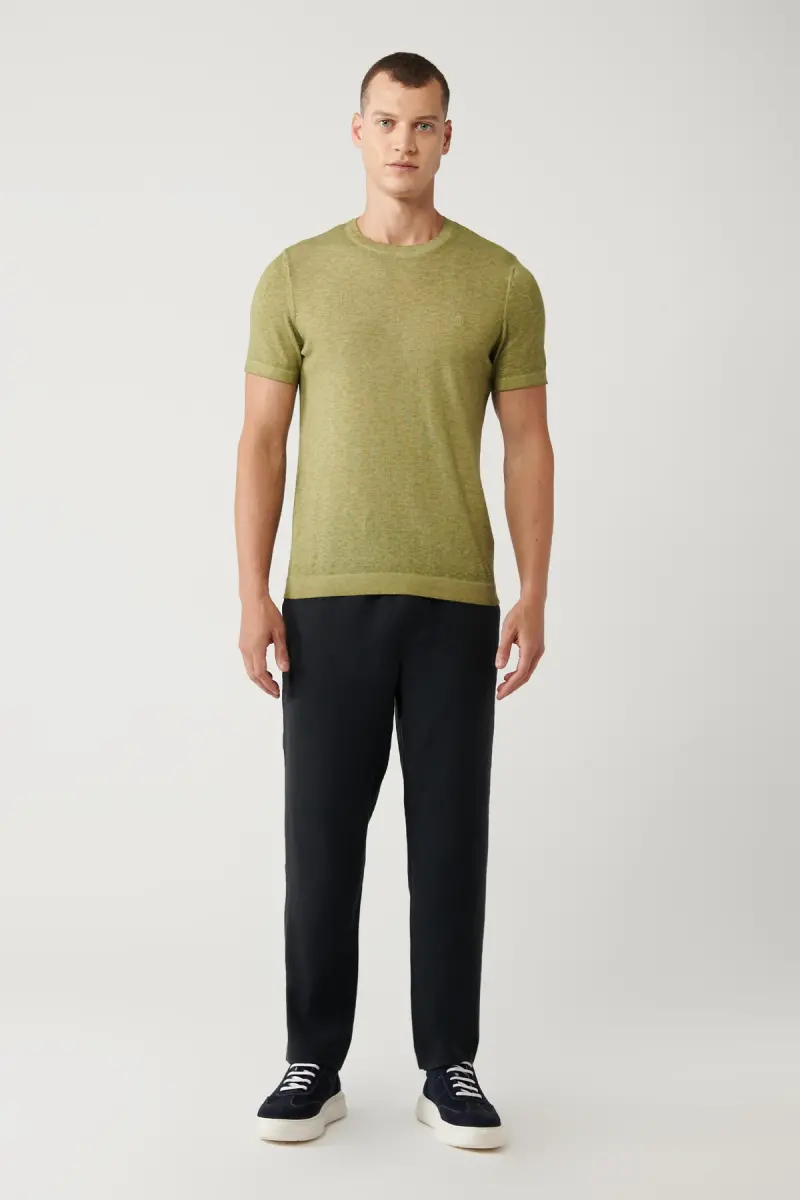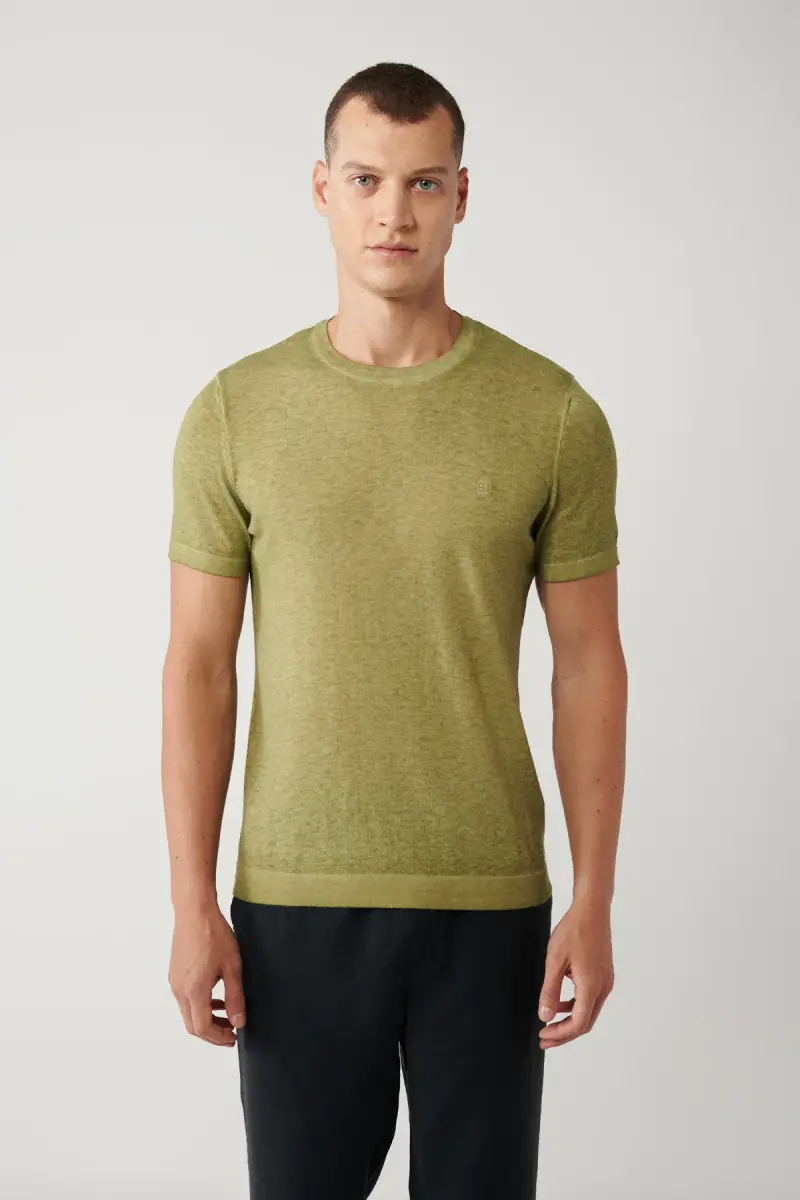 Kundalik uslubingizga zamonaviy va qulaylik qo'shish uchun mukammal tanlov bo'lgan bu erkaklar uchun haki rangli bisiklet yoqali triko futbolkasi, yumshoq matolari va zamonaviy dizayni bilan e'tiborni tortadi. Garment dyed bo'yoq texnikasi yordamida erishilgan noyob rang o'tishlari, futbolka bilan har qanday kombinatsiyaga mos keladigan jozibali ko'rinish beradi.