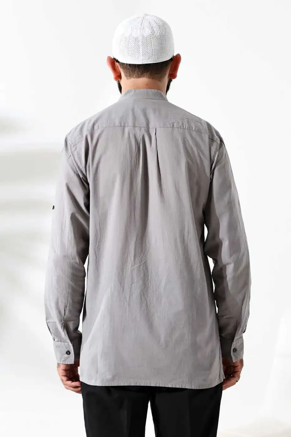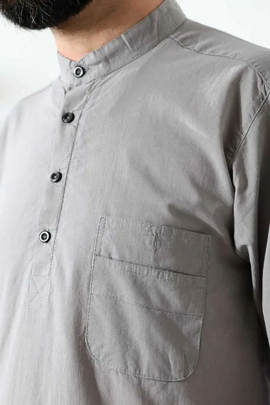The Men's 100% Cotton Voile Relaxed Fit Mandarin Collar Half-Button Gray Hajj Umrah Shirt is designed as an ideal piece for everyday use. As part of the Basic collection, this shirt combines comfort and style to become a wardrobe staple. The Mandarin collar design adds a modern and stylish look, while the button closure allows for easy on and off. 100% cotton material provides skin-friendly touches for maximum comfort. The relaxed fit pattern offers a flattering yet non-restrictive fit and accommodates different body types.