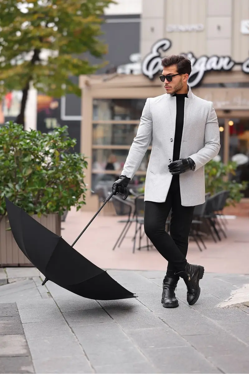 Erkek Açık Gri Dar Kesim Dik Yaka Kaşe Kaban-AÇIKGRİ