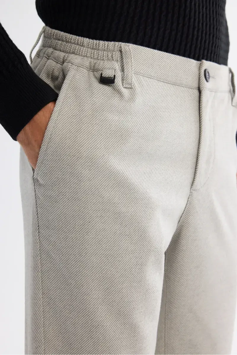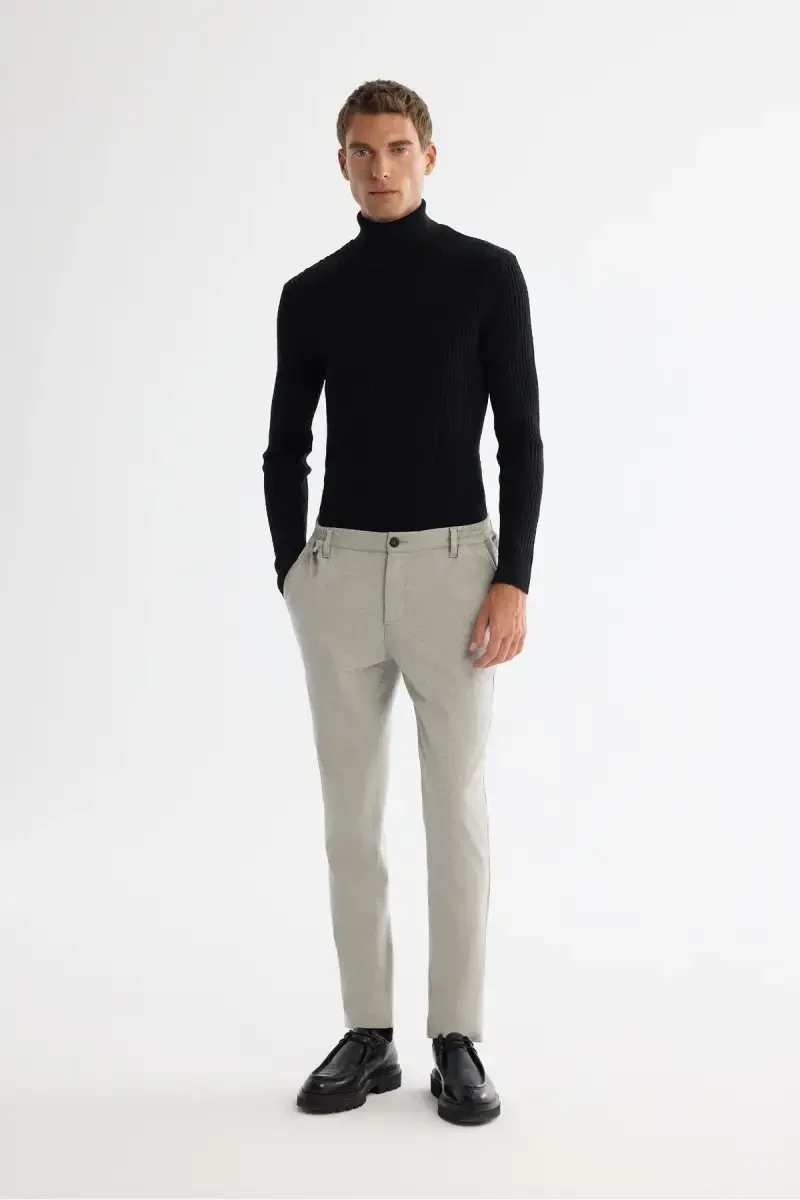 The Men's Light Grey Relaxed Fit Elastic Side Diagonal Trousers feature a special design that combines elegance and comfort. Offered with AVVA quality, these trousers are one of the essential pieces that should be in the wardrobe of the modern man. You can easily prefer these trousers both in daily use and on more special occasions, and they will add a unique touch to your style.One of the most striking features of the trousers is the elastic detail on the sides. This feature offers comfortable use without restricting your freedom of movement throughout the day. At the same time, thanks to its relaxed fit, it does not fit your body completely, thus creating a comfortable silhouette. The diagonal pattern adds a dynamic and modern look to the trousers.The side-pocketed design adds practicality to the trousers, while the welt pockets on the back complete the elegance. The front button and zipper closure detail makes the trousers easy to use. The light gray color can be easily combined with tops in different colors and styles, thus offering versatile use.These trousers are made of a mixture of 63% polyester, 34% viscose and 3% elastane. This special fabric blend ensures that the trousers are both durable and comfortable. Polyester ensures that the trousers are long-lasting and do not wrinkle easily, while viscose makes the fabric soft and light. Elastane adds flexibility to the trousers, supporting your freedom of movement.Colors may vary due to light differences in studio shots, so there may be slight differences between the actual color of the product and the color on your screen. The model is 188 cm tall, has a chest of 89 cm, a waist of 70 cm and hips of 96 cm. The sample size on the model is 32. This information will help you choose the right size.Men's Light Grey Relaxed Fit Elastic Side Diagonal trousers are an ideal choice for men who care about both their elegance and do not want to compromise on their comfort. With these trousers, which will be an indispensable part of your wardrobe, you can reflect your style in any environment.