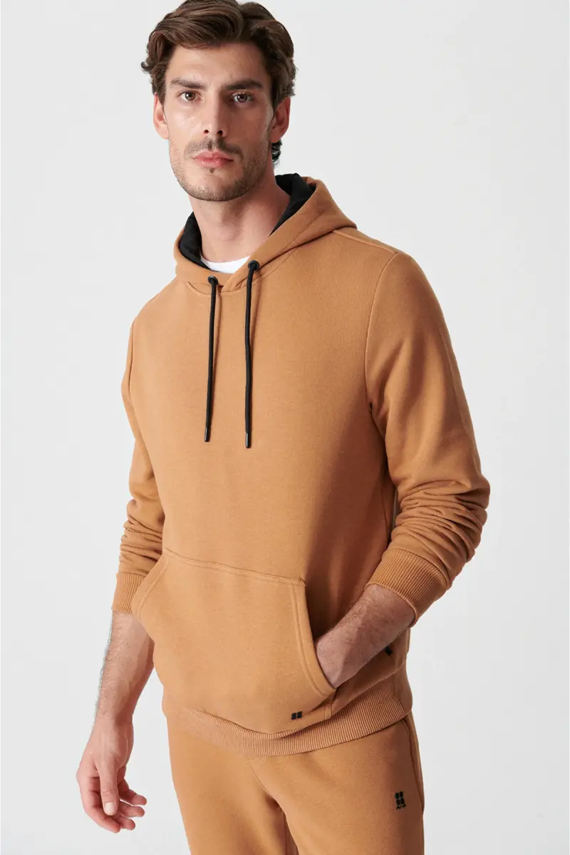 Erkek Açık Kahverengi Kapüşonlu 3 İplik Şardonlu Pamuklu Sweatshirt E001018-Açık Kahve