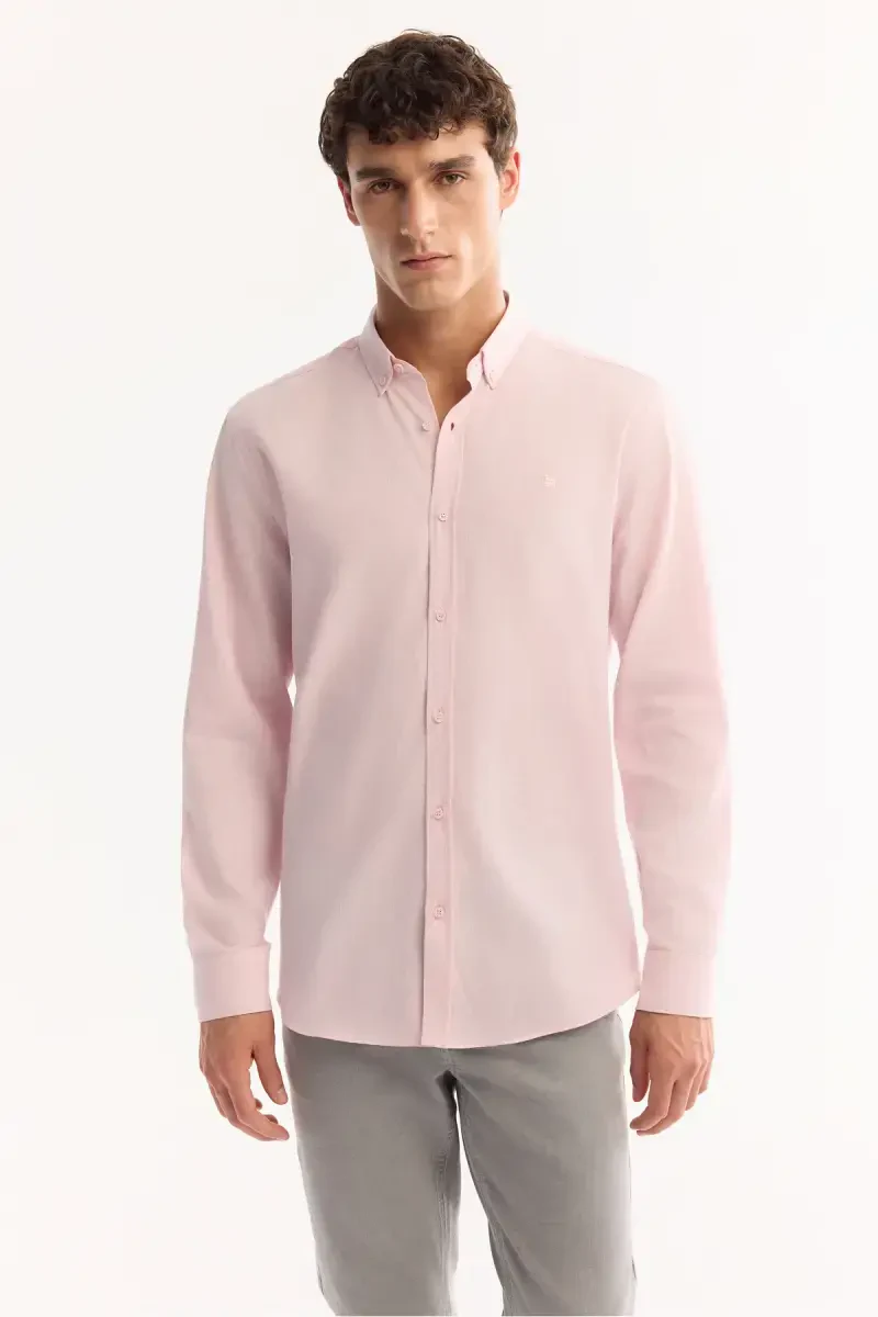 Идеальный выбор, чтобы добавить современный штрих к вашему повседневному стилю! Эта рубашка, выделяющаяся своим светло-розовым цветом, сочетает в себе воздухопроницаемость и комфорт благодаря своей льняной текстуре. Изготовленная из 100% хлопковой ткани, рубашка обеспечивает идеальную посадку для любой фигуры благодаря своему отложному воротнику и покрою Comfort Fit.