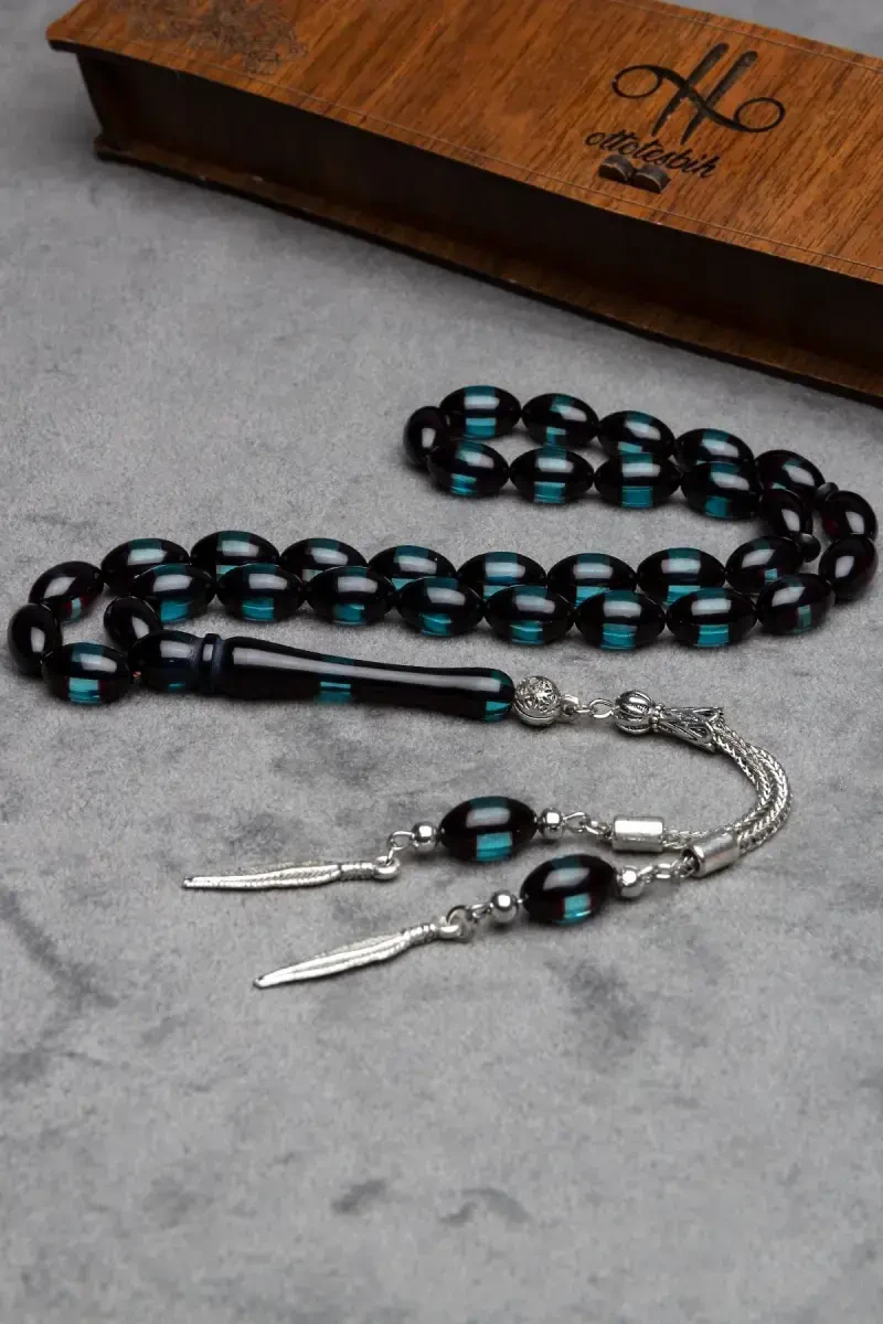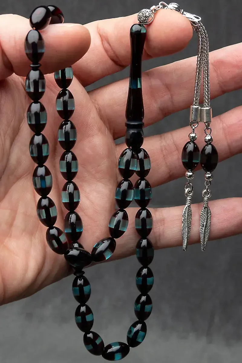 Crafted with care from natural barley stones, this tasbih with its aqua green color offers a striking elegance. Each bead is meticulously cut barley stones, enriched with delicate surmeli details, reflecting the warmth of powder amber. Its handcrafted nature adds a special value to each piece of the tasbih.