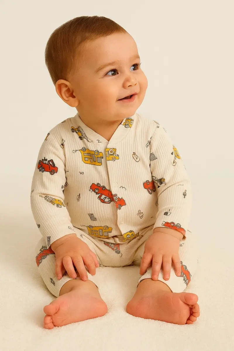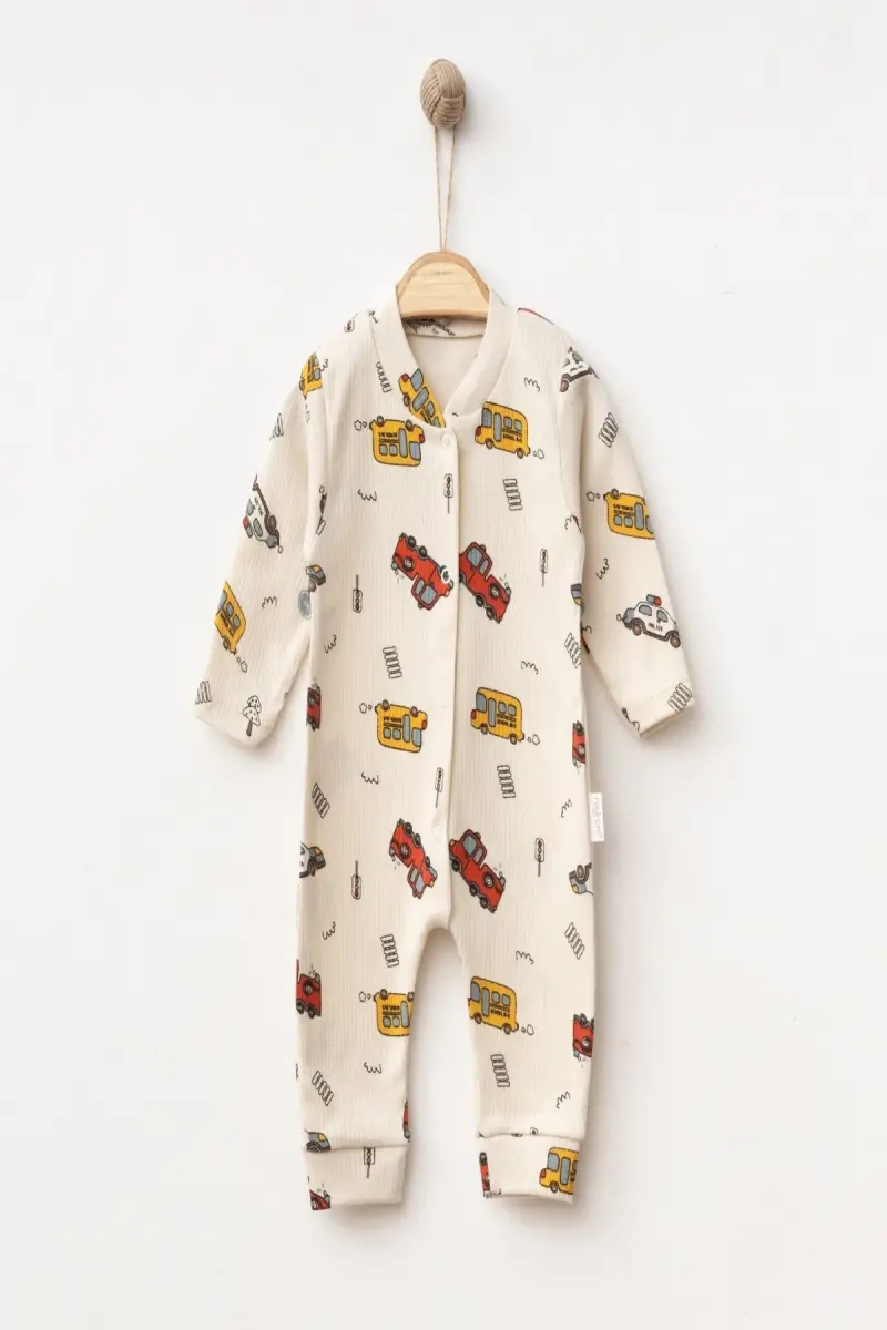 Erkek Bebek Araba Baskılı Çıtçıtlı Yenidoğan Bebek Tulumu %100 Pamuk Esnek 1-3-6 Aylık-Ekru Araba
