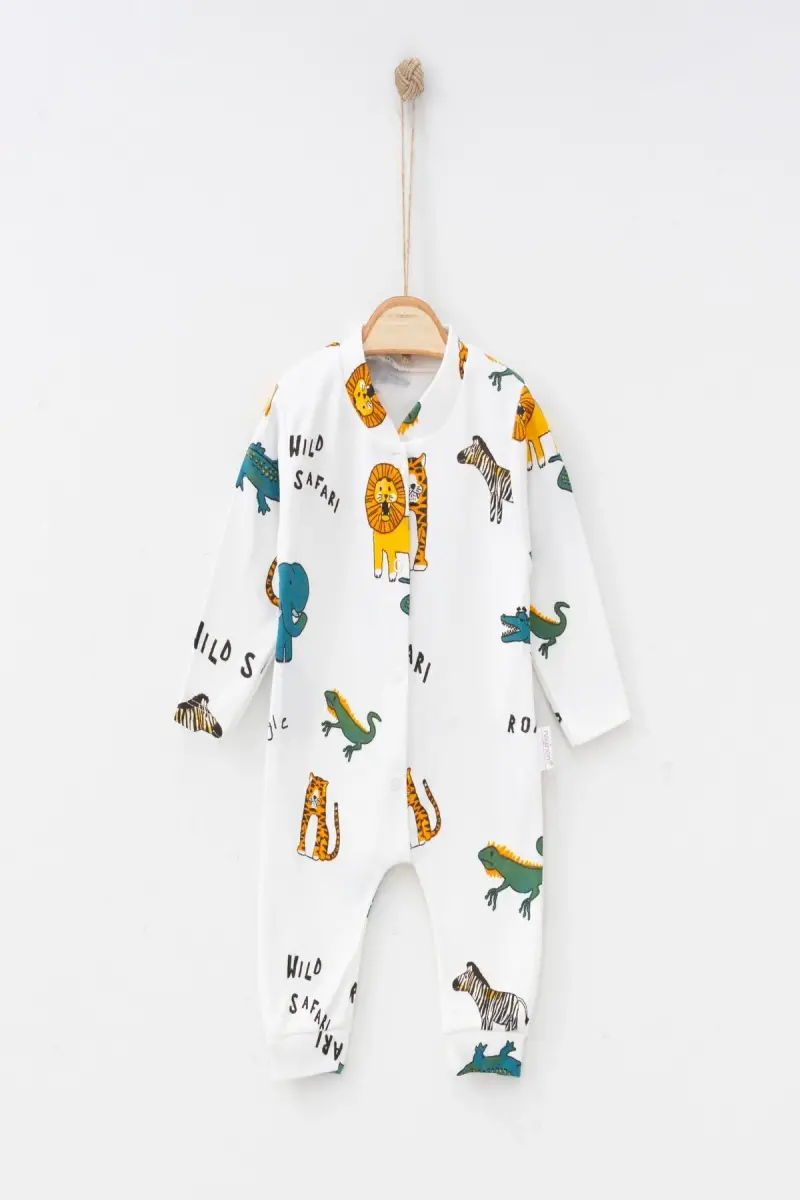 Erkek Bebek Safari Baskılı Çıtçıtlı Yenidoğan Bebek Tulumu %100 Pamuk Esnek 1-3-6 Aylık-Beyaz Safari