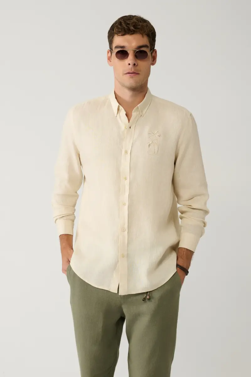 Erkek Bej Gömlek Düğmeli Yaka %100 Keten Nakış Detaylı Comfort Fit A41y2232 ile tarzınıza özgün bir dokunuş katın.