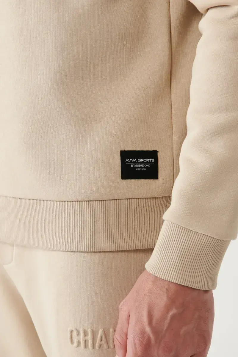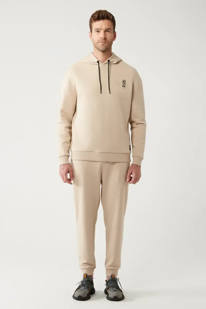 Erkaklar uchun bej rangli kaputli, gofrilangan bosma, 3 iplikli shardon, qulay kesilgan svitshot A32y1190 bilan har doim zamonaviy va qulay bo'ling!