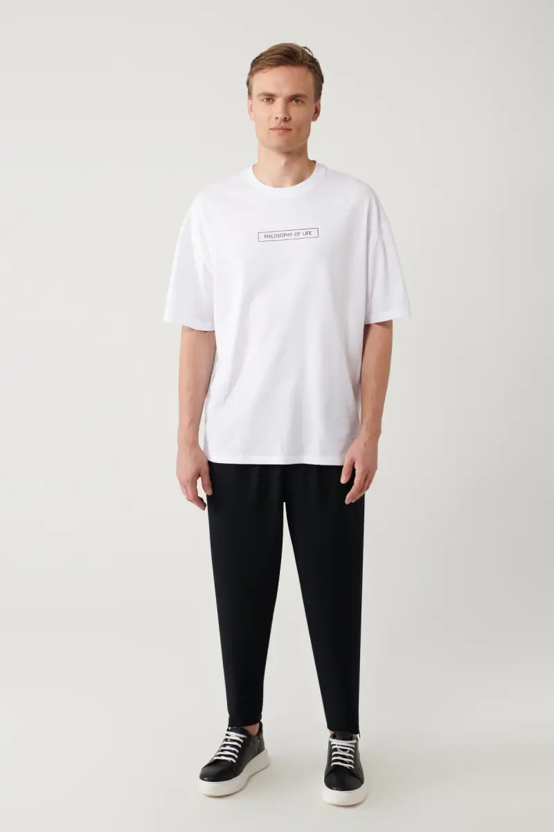 Мужская белая футболка с принтом оверсайз с круглым вырезом - A41y1173