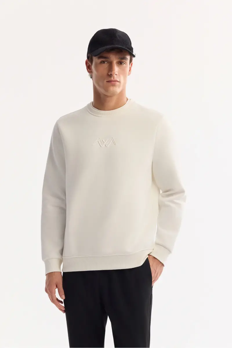 Erkek Beyaz Bisiklet Yaka Pamuklu Şardonlu Baskılı Regular Fit Sweatshirt B001033-Beyaz