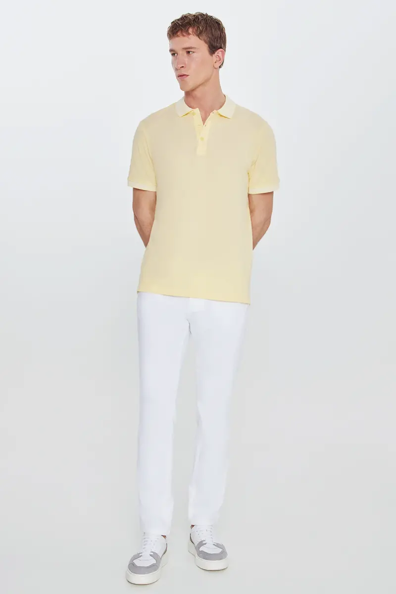 Erkek Çekmeyen Pamuklu Kumaş Slim Fit Dar Kesim Sarı-Beyaz Kıvrılmaz Polo Yaka Tişört-Sarı