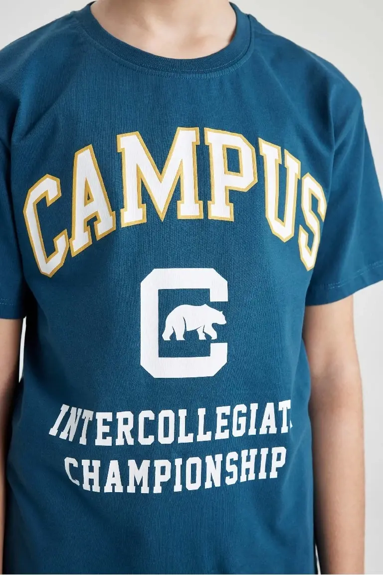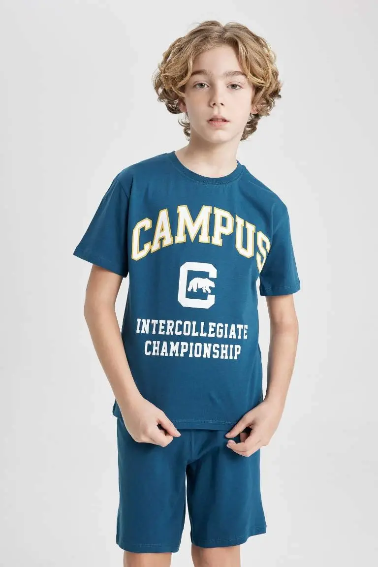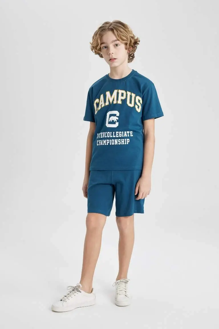 Erkek Çocuk 2'li Takım Baskılı Kısa Kollu Tişört Şort-Petrol