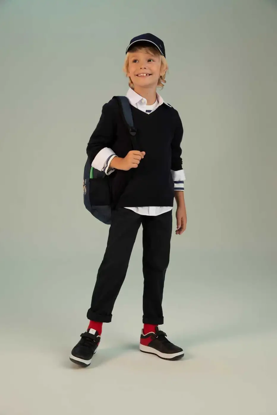 These navy gabardine school trousers for boys are the perfect choice for school days, with their high-quality fabric and stylish design, ensuring your child looks both smart and comfortable every day.