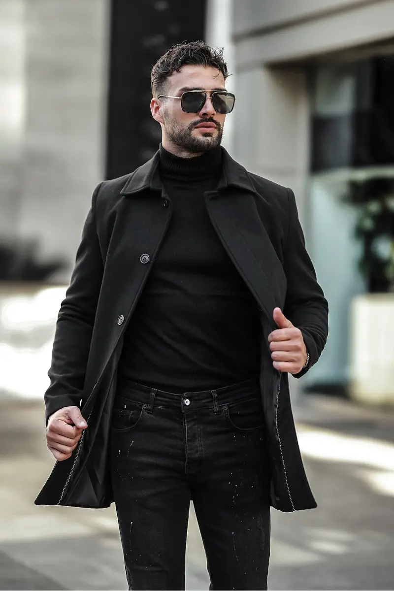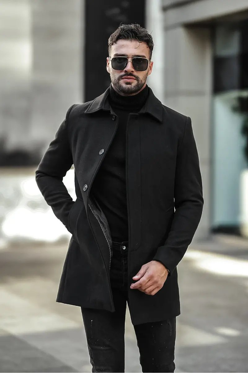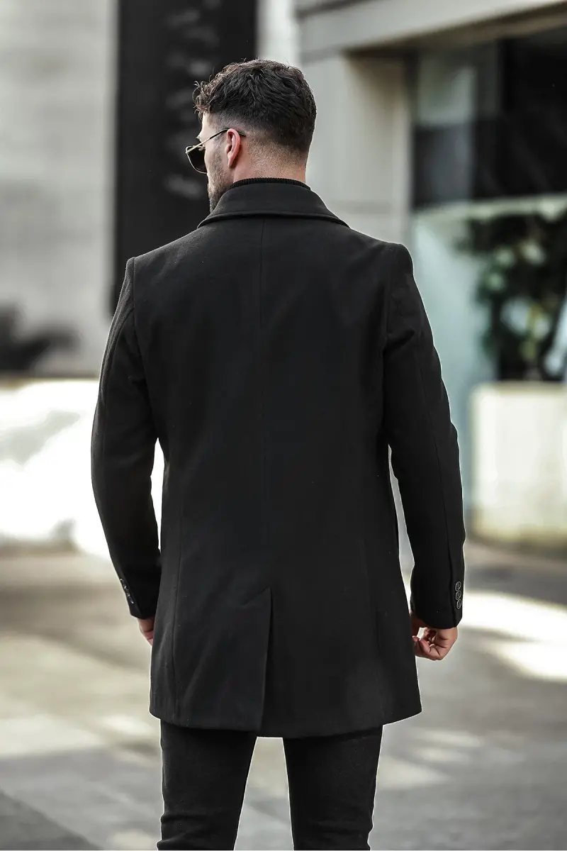 Erkek Dar Kesim Uzun Kaşe Kaban-Siyah