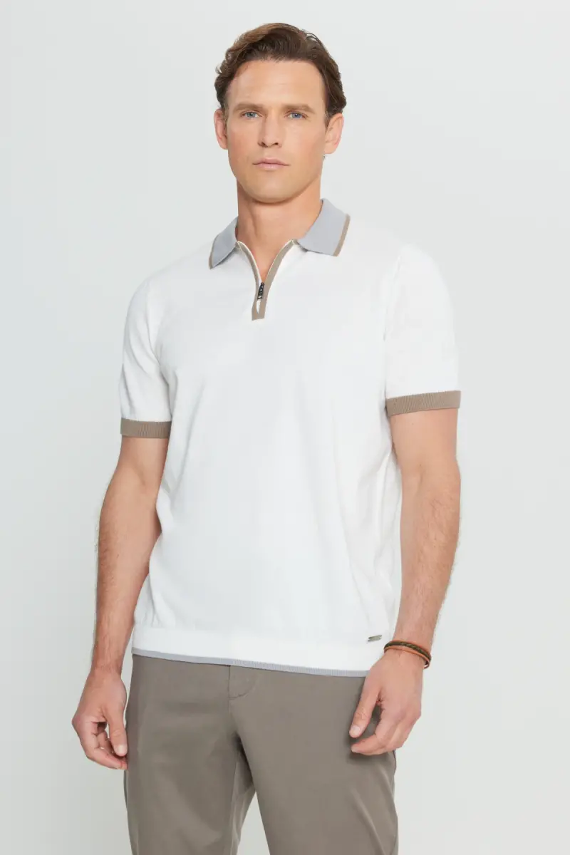 Erkek Ekru %100 Pamuk Standart Fit Normal Kesim Polo Yaka Triko Tişört-Ekru