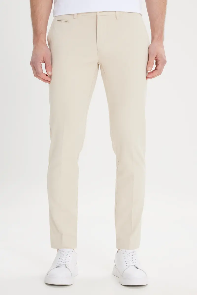 Erkek Ekru Slim Fit Dar Kesim Yan Cepli Pamuklu Esnek Armürlü Pantolon-Ekru