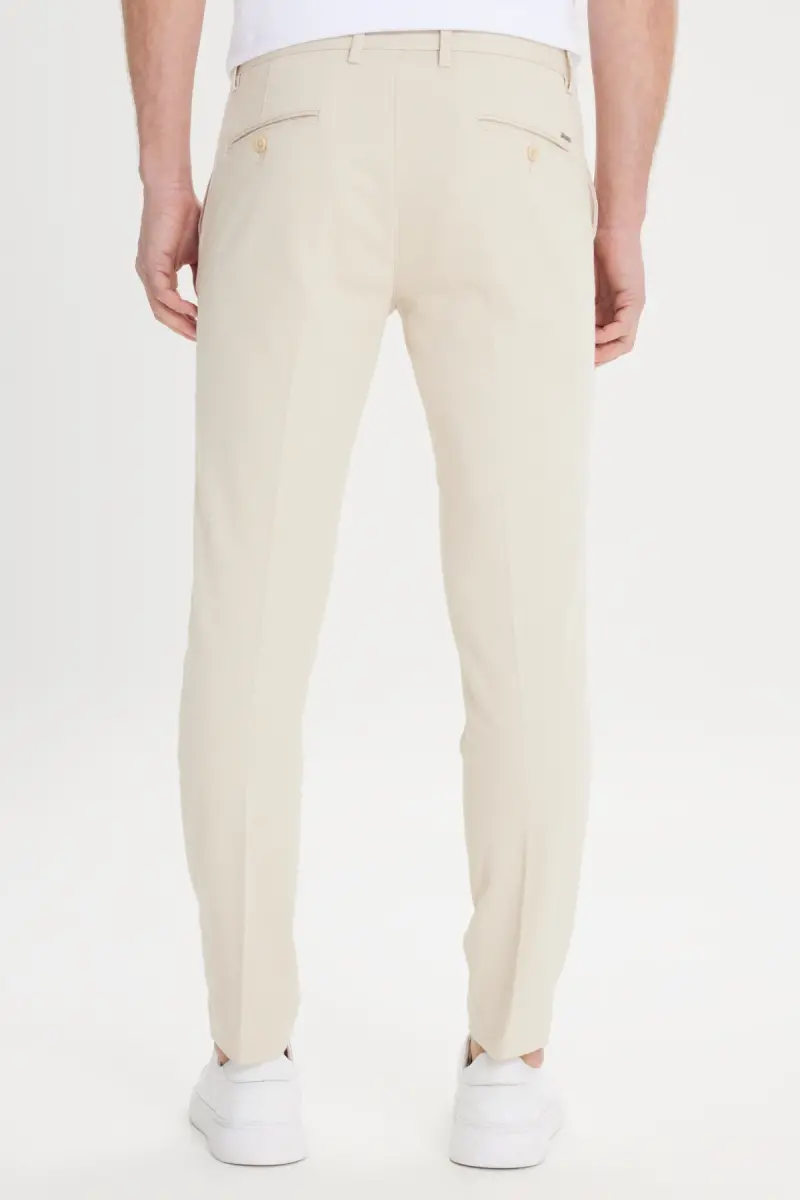 Erkek Ekru Slim Fit Dar Kesim Yan Cepli Pamuklu Esnek Armürlü Pantolon-Ekru