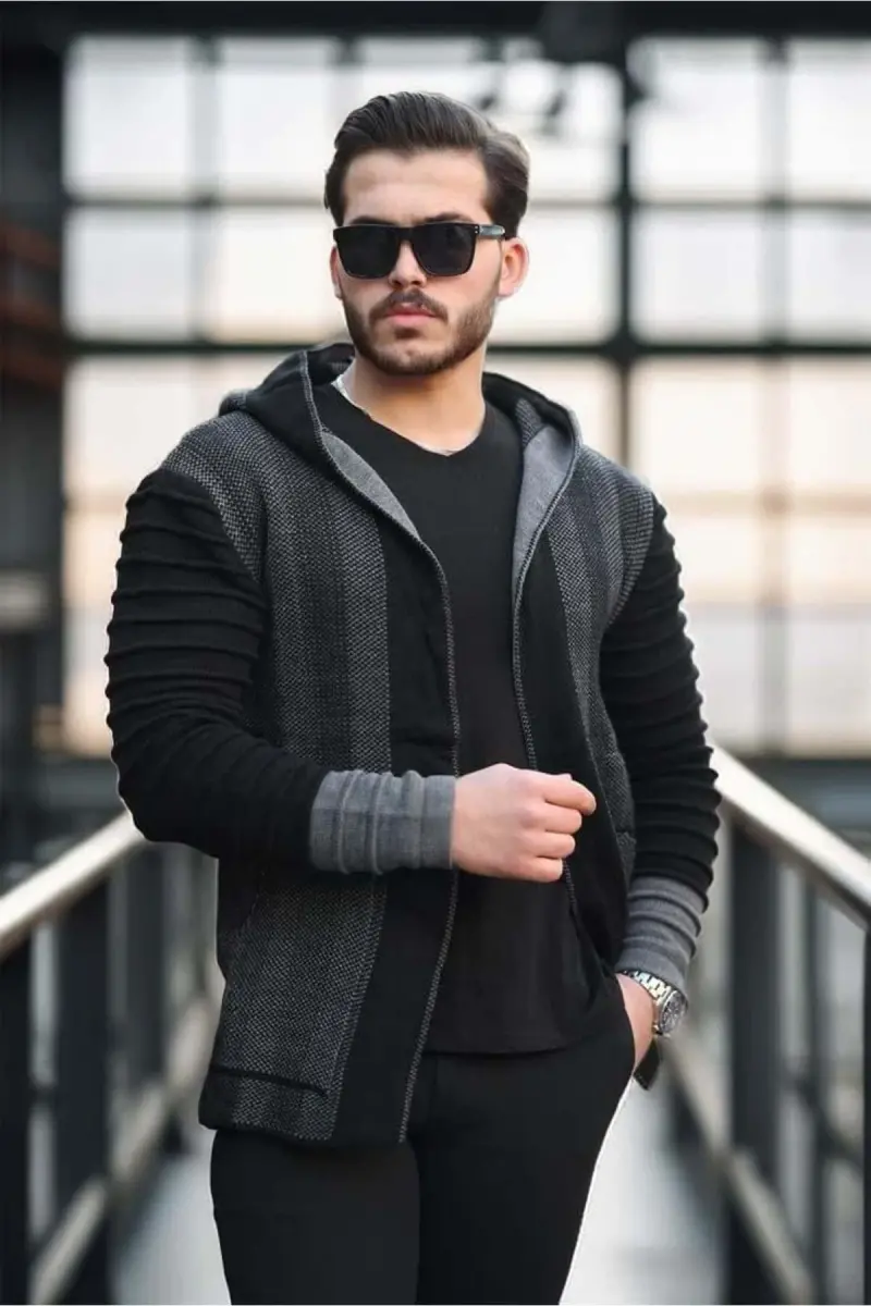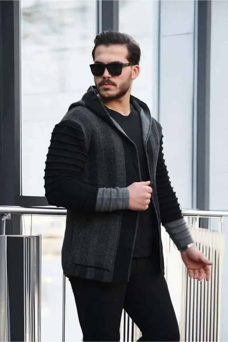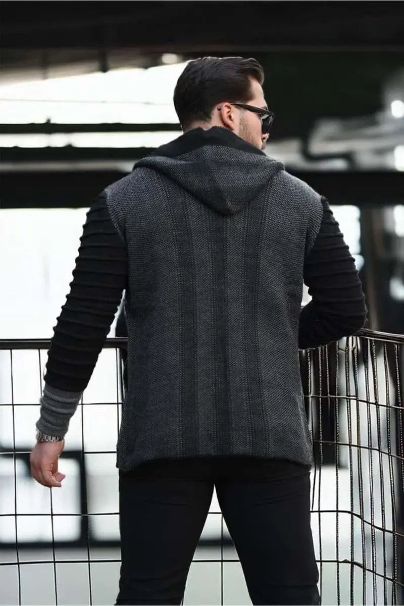 Erkek Füme Kolları Desenli Panço Hırka-Füme