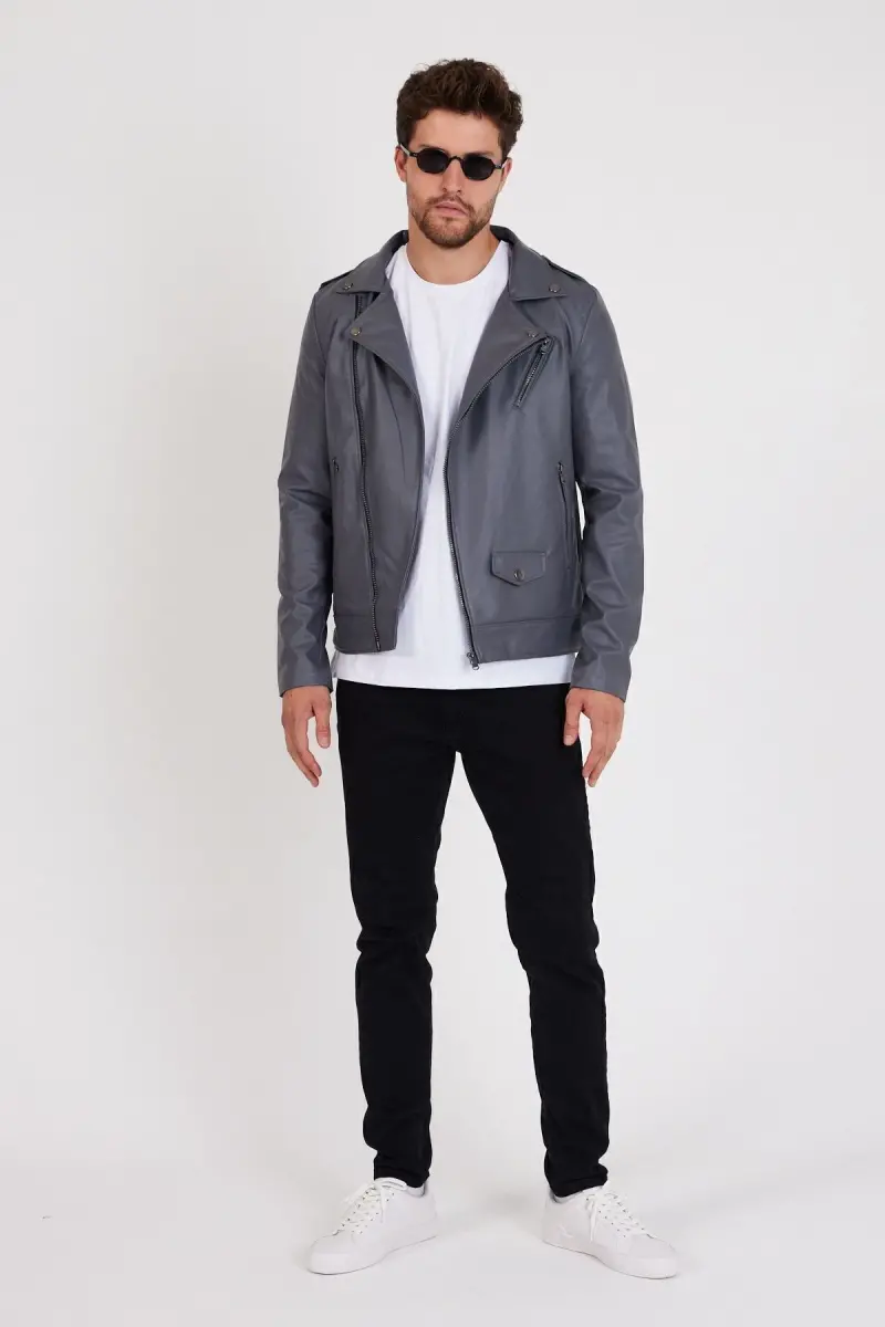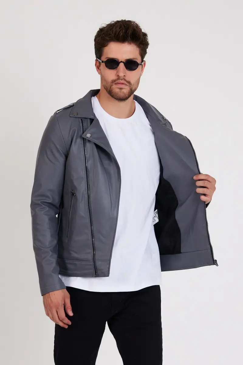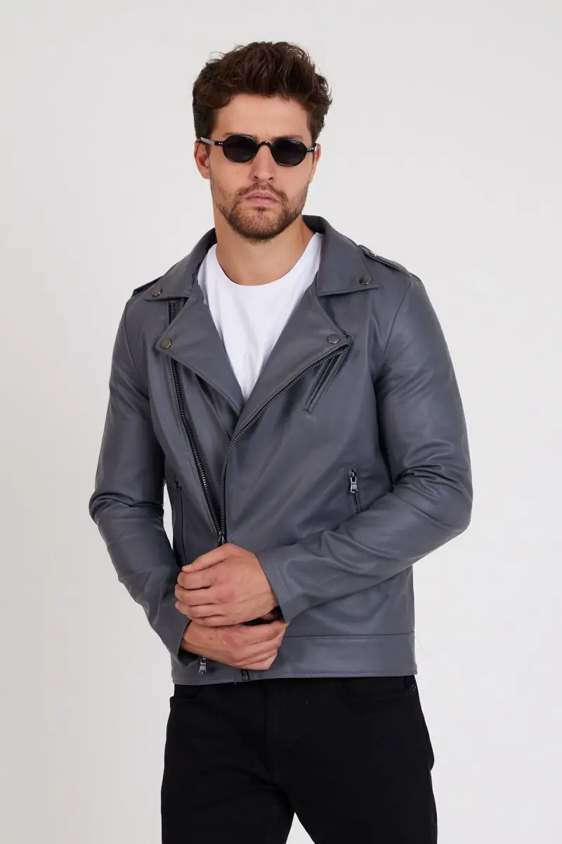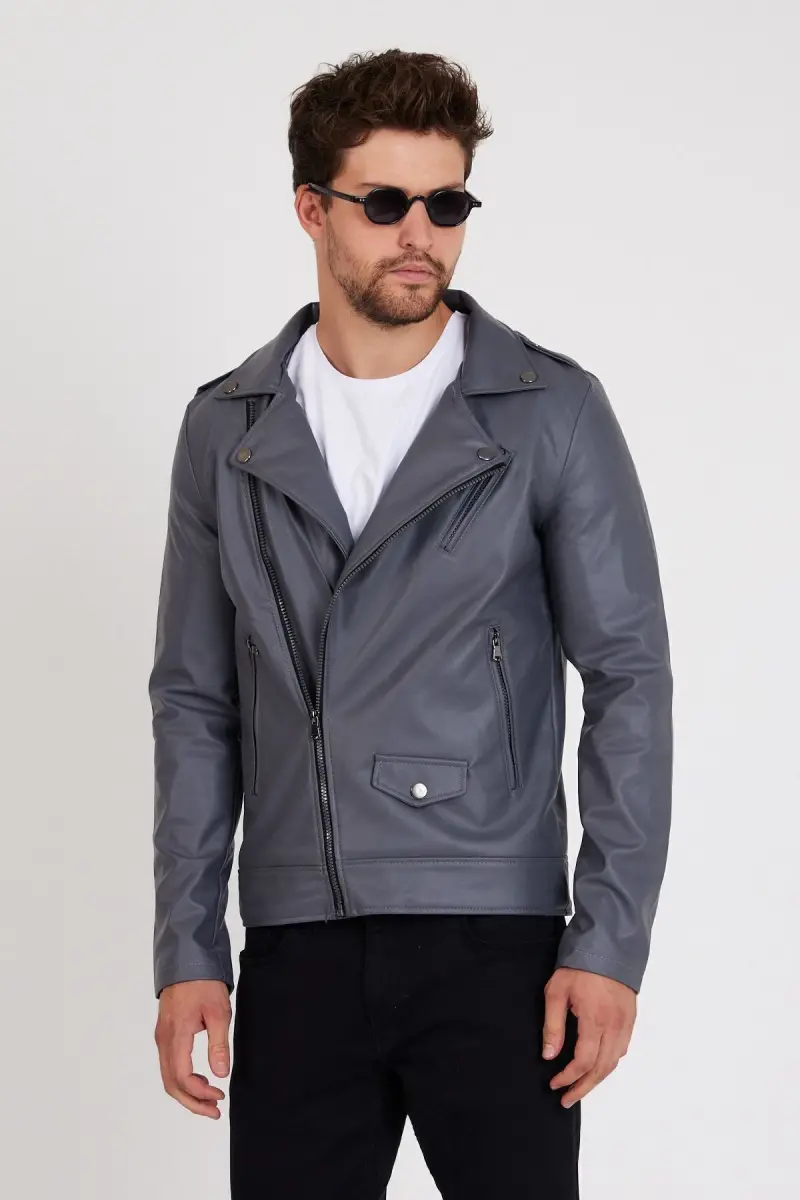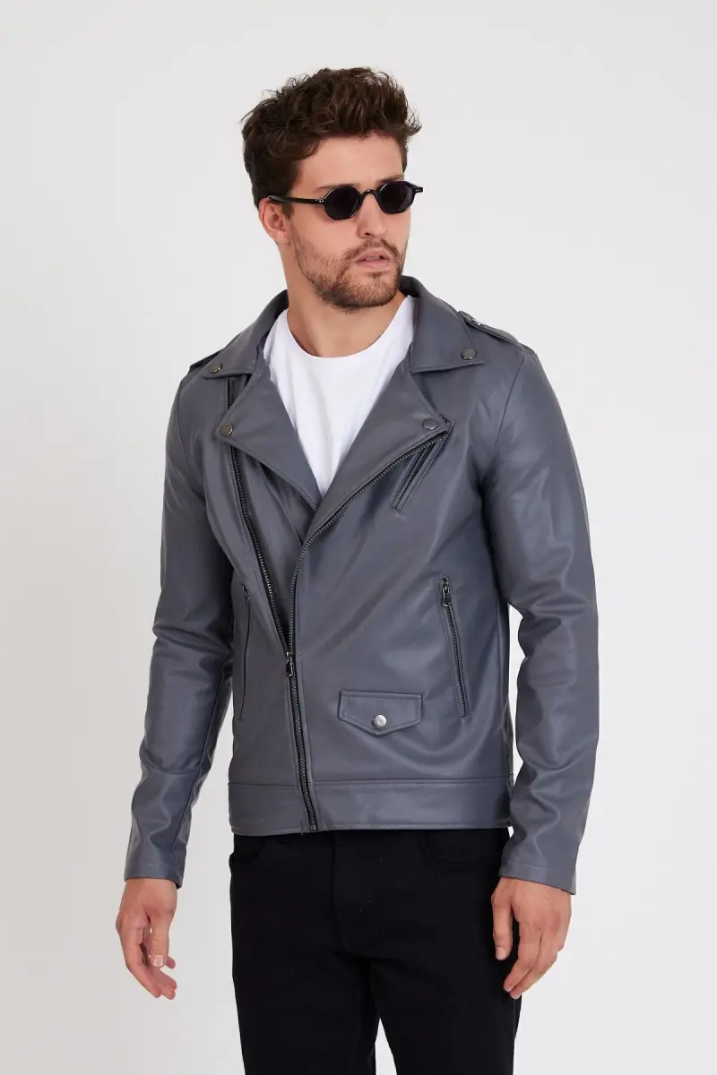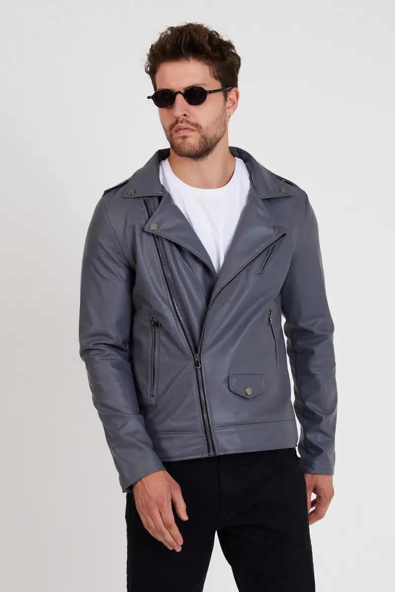 Erkek Gri Renk Yeni Sezon Çapraz Fermuarlı Deri Ceket Mont-GRİ
