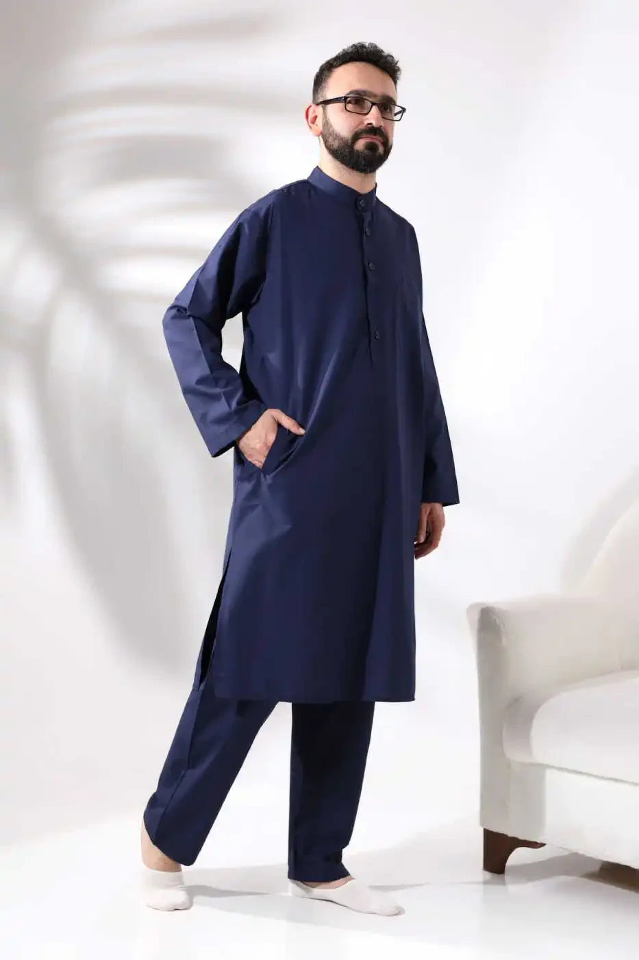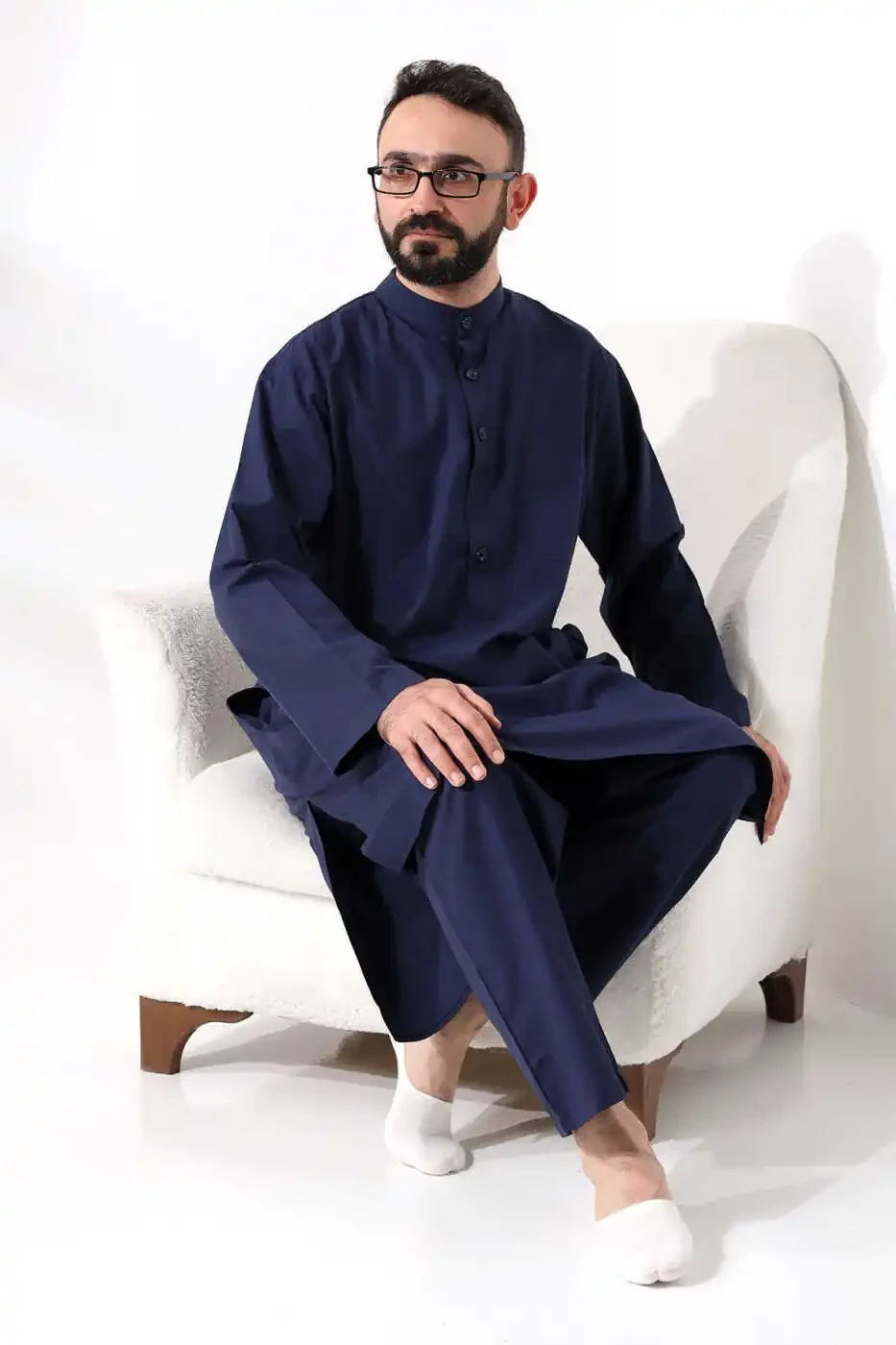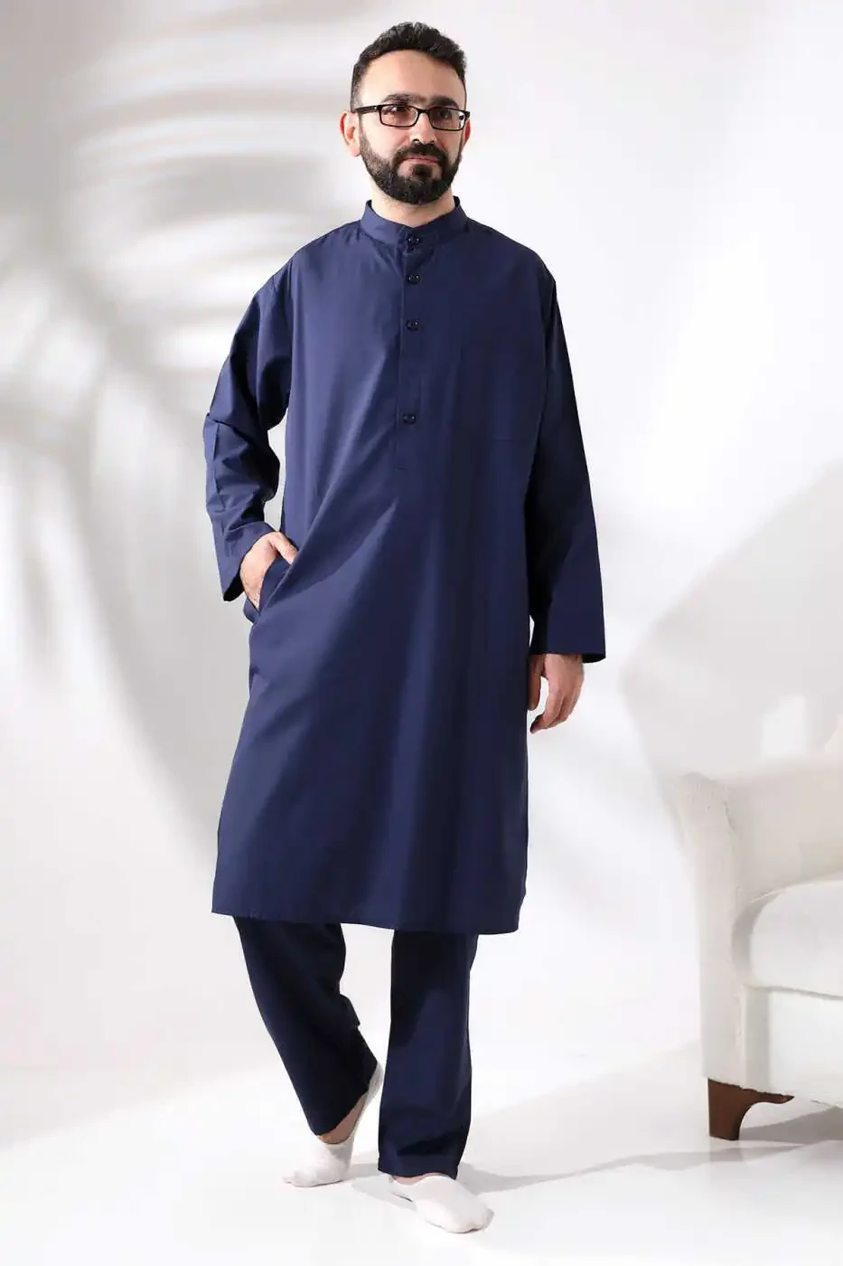 Muqaddas yerlarga hajj va umra safaringizda o'zingizni zamonaviy va qulay his qiling. Erkaklar uchun Haj va Umra kiyimlari ikki qismli yuqori va pastki afg'on kostyumi to'q ko'k ushbu maxsus davr uchun a'lo tanlovdir.